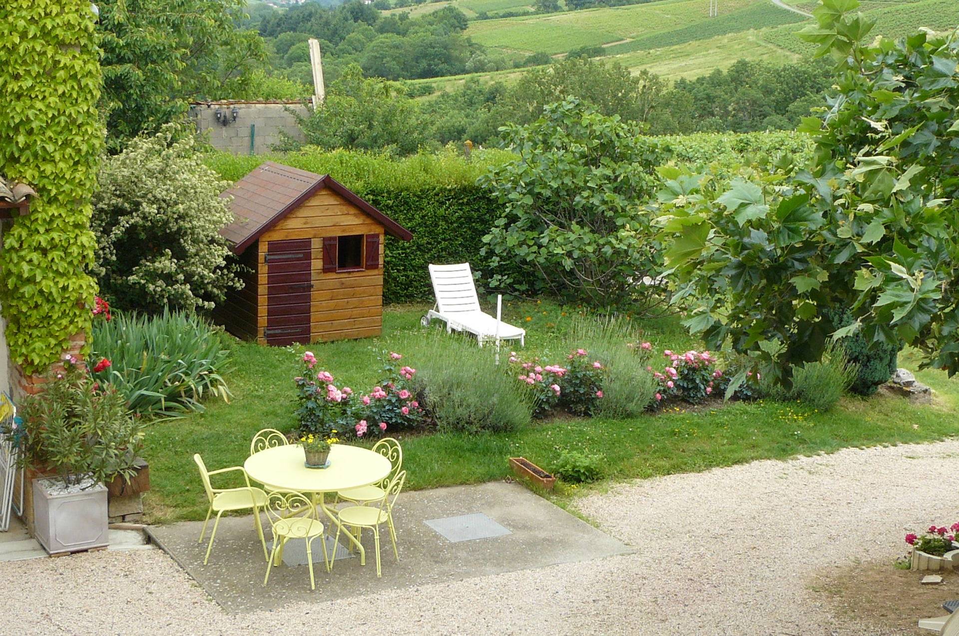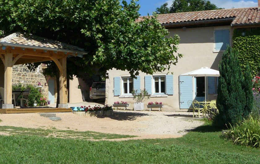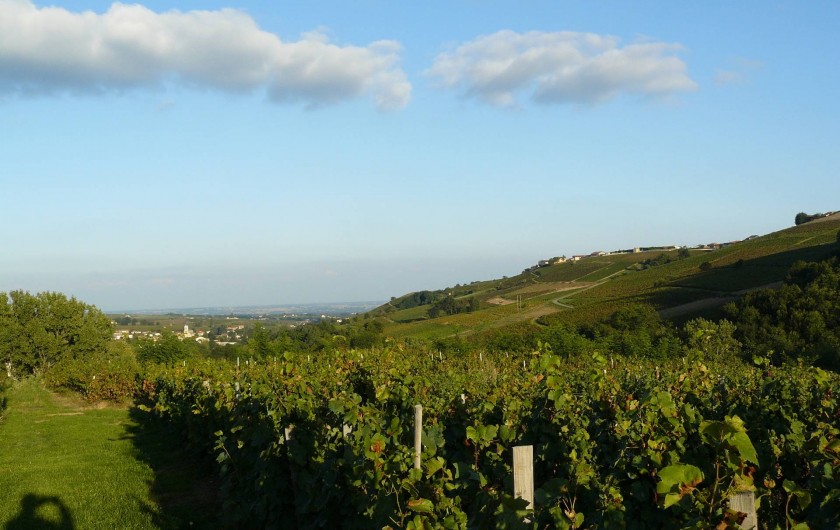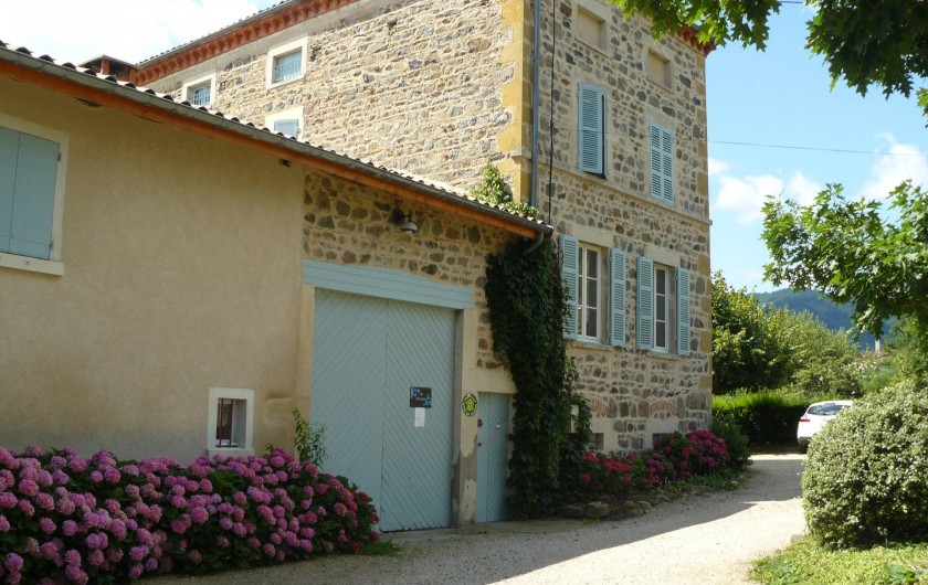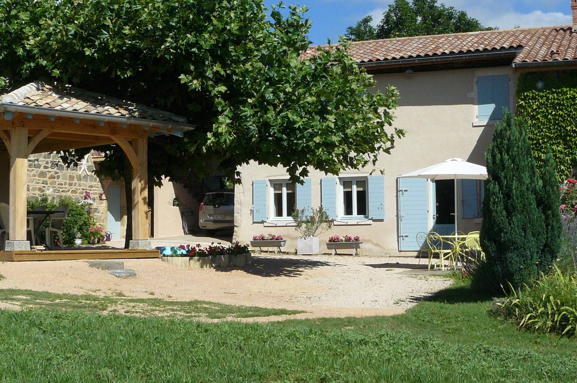 En Pays Beaujolais, calme et verdoyant, notre Gite 3 Epis (Gite de France) est installé dans une maison de caractère mitoyenne à la nôtre. Une fois franchi le portail, vous accédez à la cour ombragée et fleurie, une terrasse couverte et un vaste terrain équipé de jeux d'enfants. Le charme de son intérieur tient au choix des matériaux. Larges vues sur vallée de la Saône et vallée couverte de vignes. Départs de balades. L'habitation comporte deux niveaux. En rez-de-chaussée : cuisine aménagée ouverte sur le séjour avec plafond à la française, cheminée. A l'étage, deux