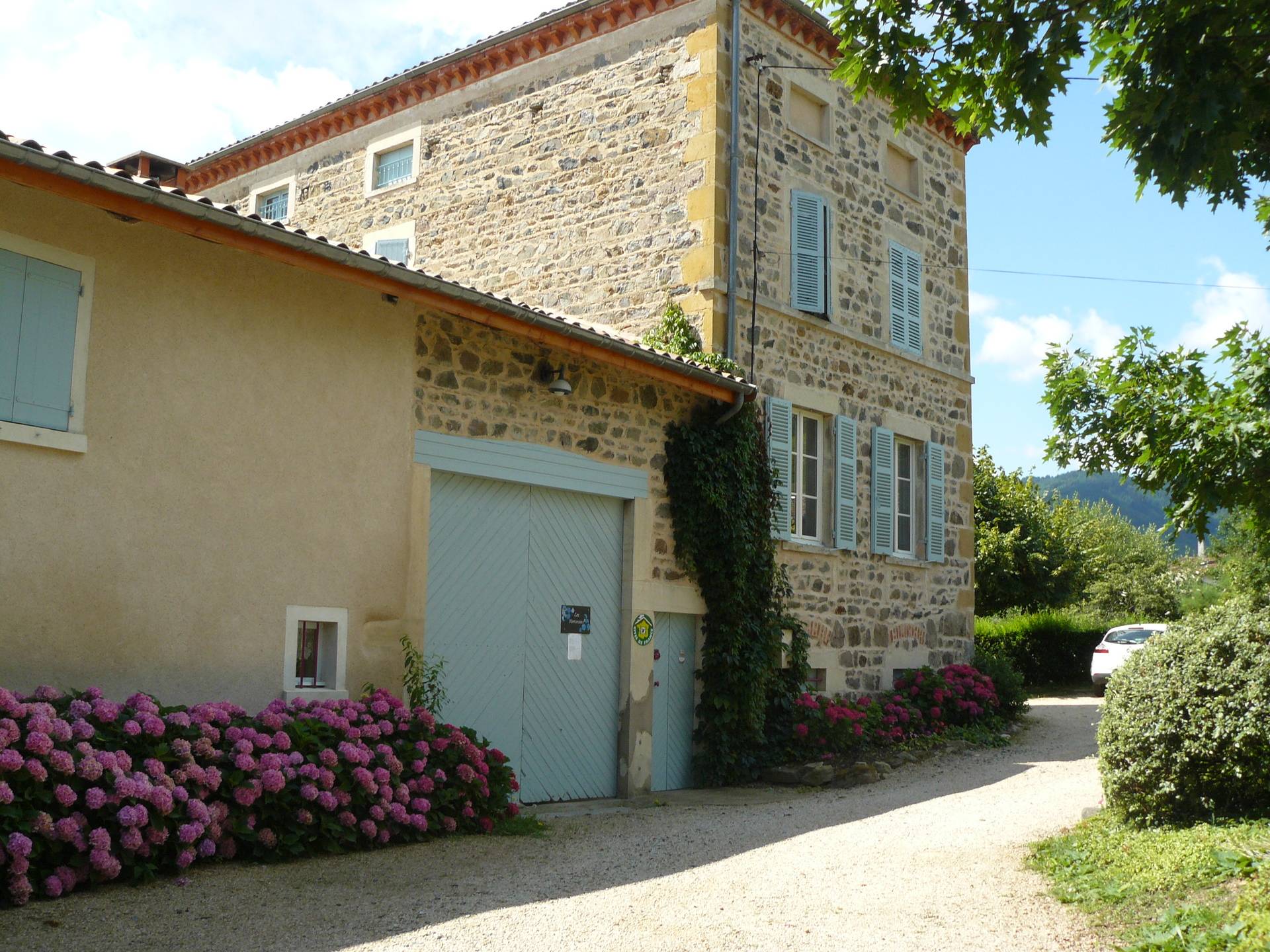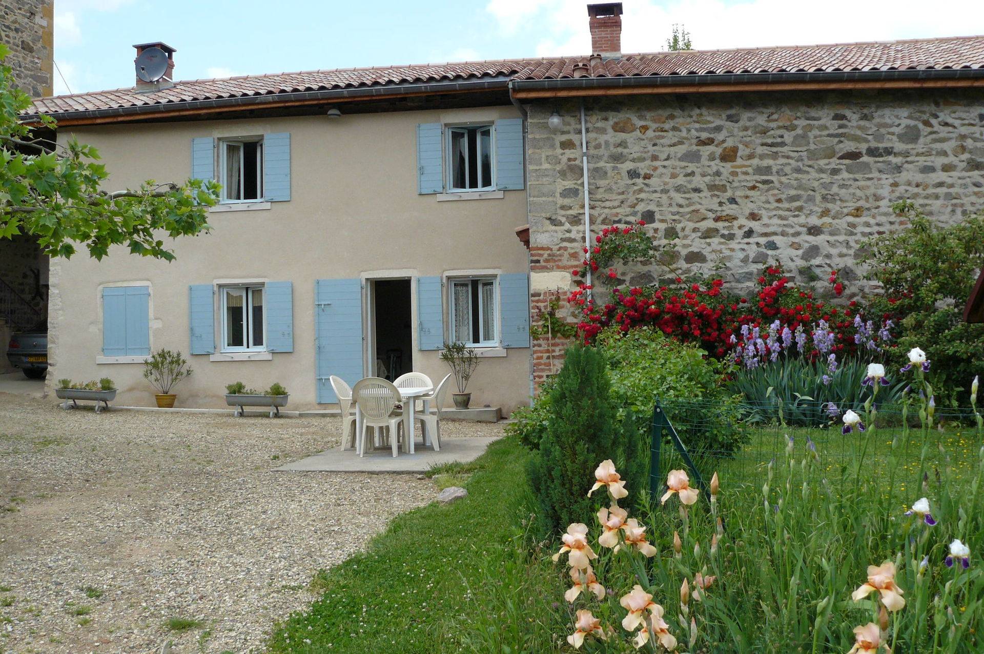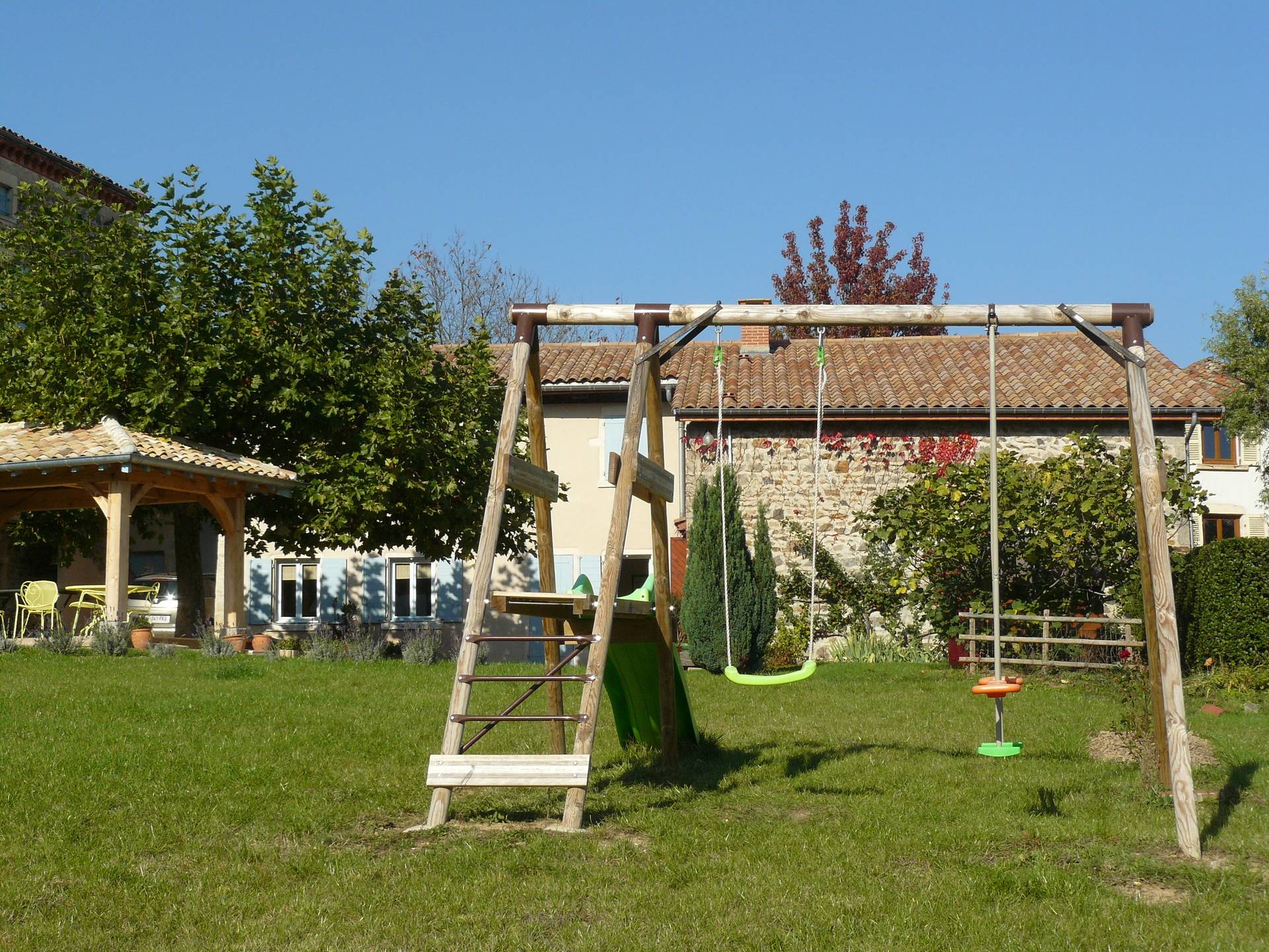 En Pays Beaujolais, calme et verdoyant, notre Gite 3 Epis (Gite de France) est installé dans une maison de caractère mitoyenne à la nôtre. Une fois franchi le portail, vous accédez à la cour ombragée et fleurie, une terrasse couverte et un vaste terrain équipé de jeux d'enfants. Le charme de son intérieur tient au choix des matériaux. Larges vues sur vallée de la Saône et vallée couverte de vignes. Départs de balades. L'habitation comporte deux niveaux. En rez-de-chaussée : cuisine aménagée ouverte sur le séjour avec plafond à la française, cheminée. A l'étage, deux