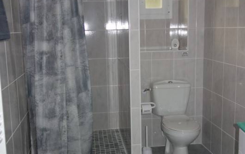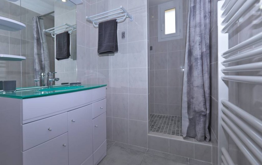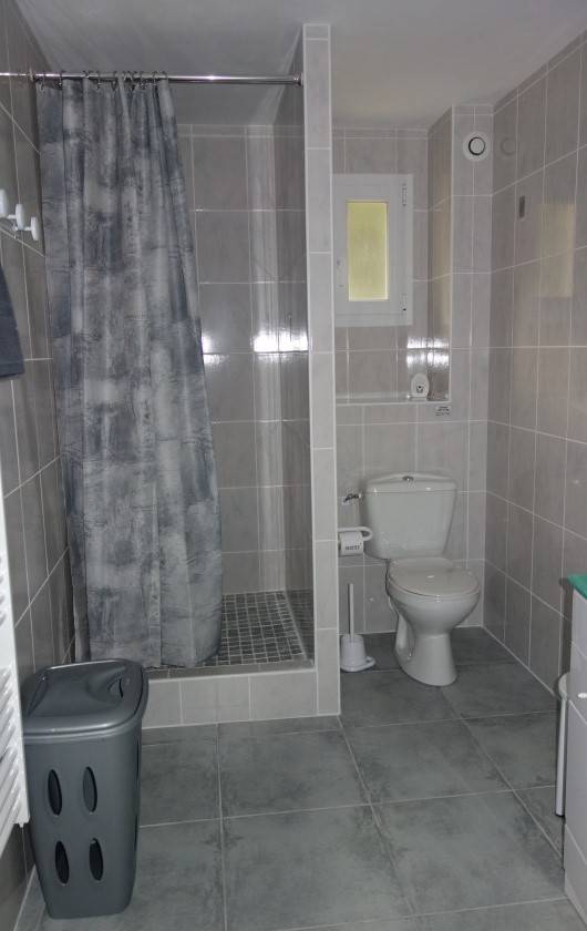 Une salle de bain, un espace très spacieux avec douche, meuble vasque, toilettes, sèche cheveux, tapis, porte manteau, panier à linge, poubelle , un WC