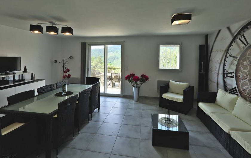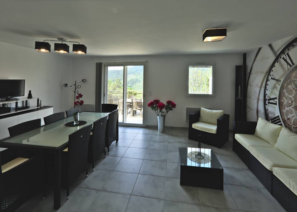 Un salon/salle à manger, une grande pièce lumineuse, grande table avec 8 fauteuils, bahut bas, lampadaire, écran plat, internet, canapé fixe 3 places, fauteuil, pouf, table basse, ventilateur
