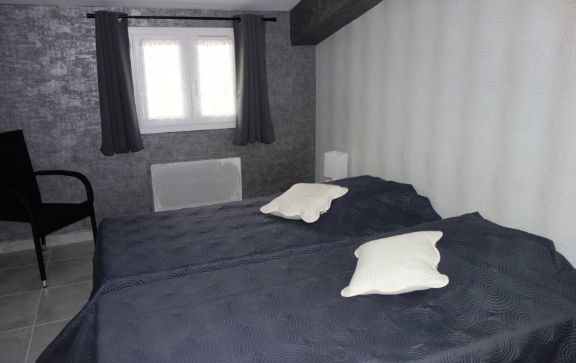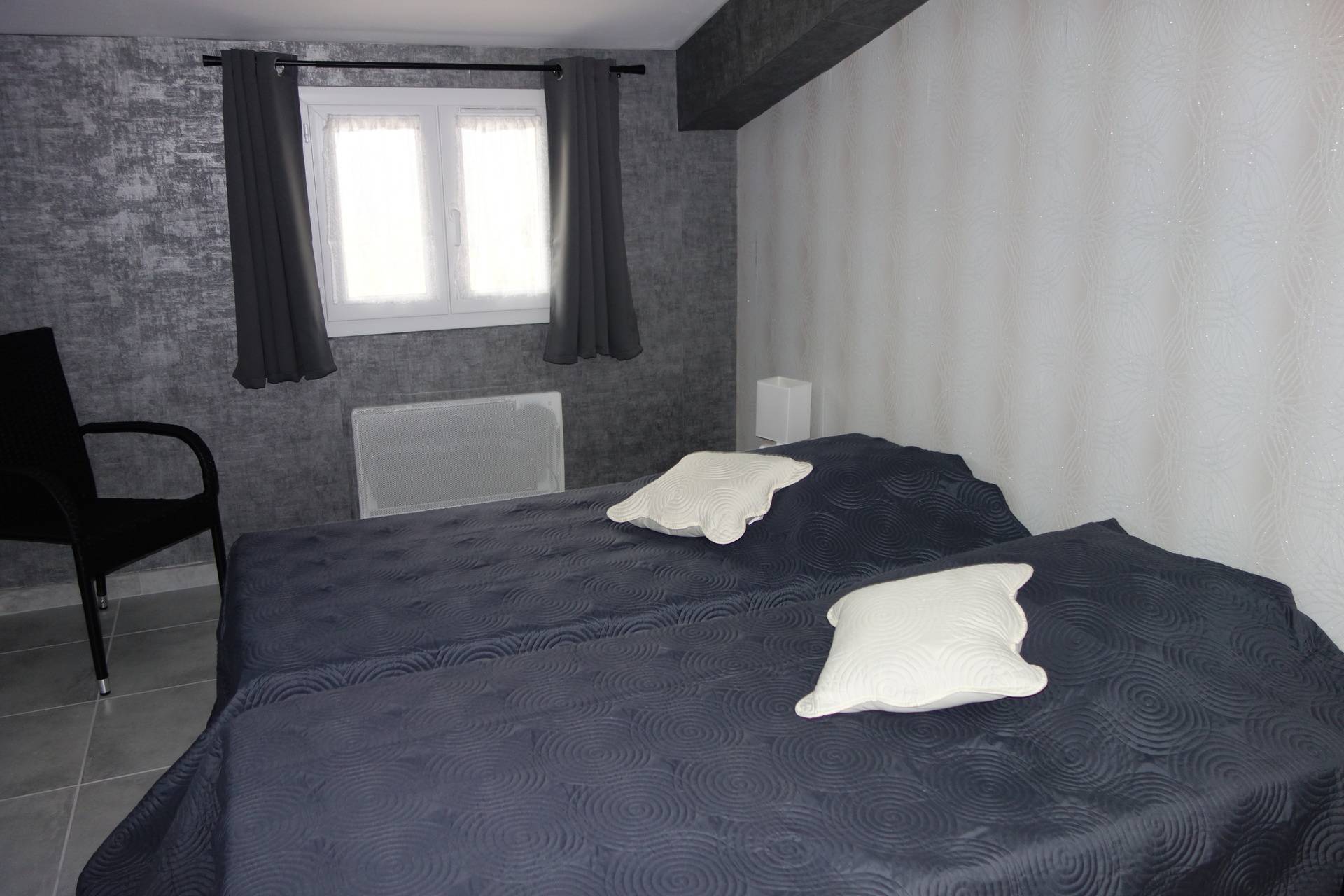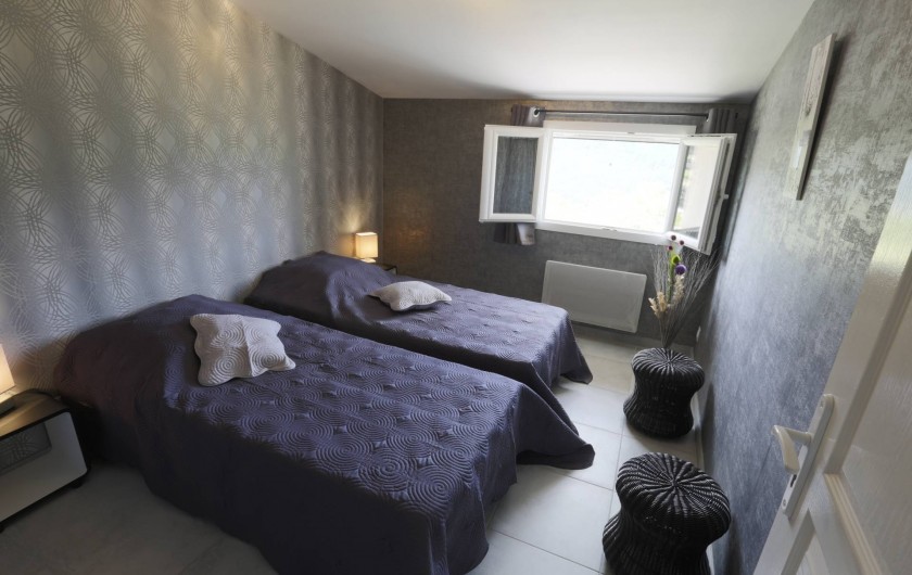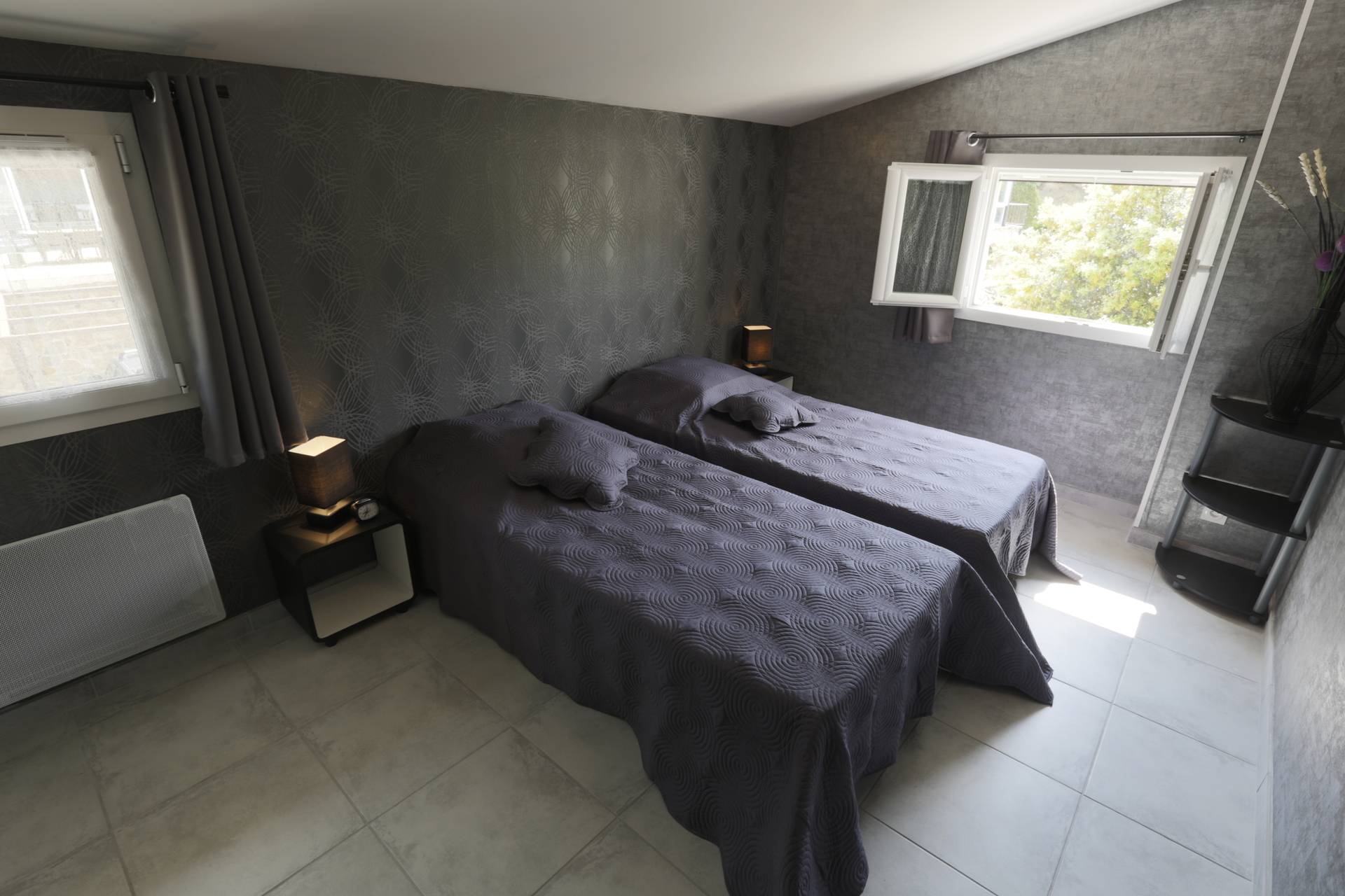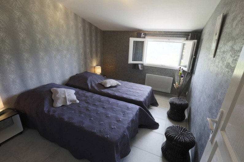 Une troisième chambre vue sur la vallée, 2 lits de 90, chevets, lampes de chevets, poufs.