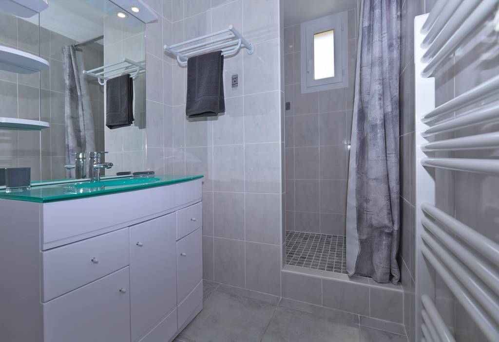 Une salle de bain, meuble vasque, douche, rideau de douche, tapis de bain, sèche cheveux, poubelle