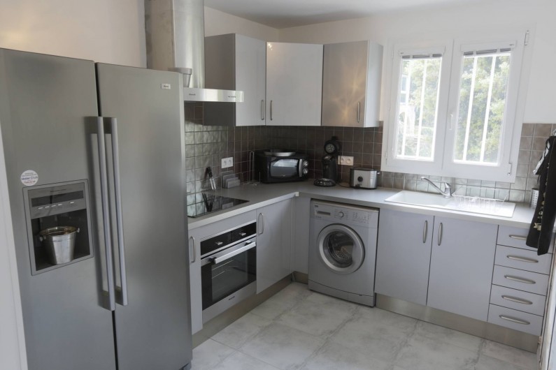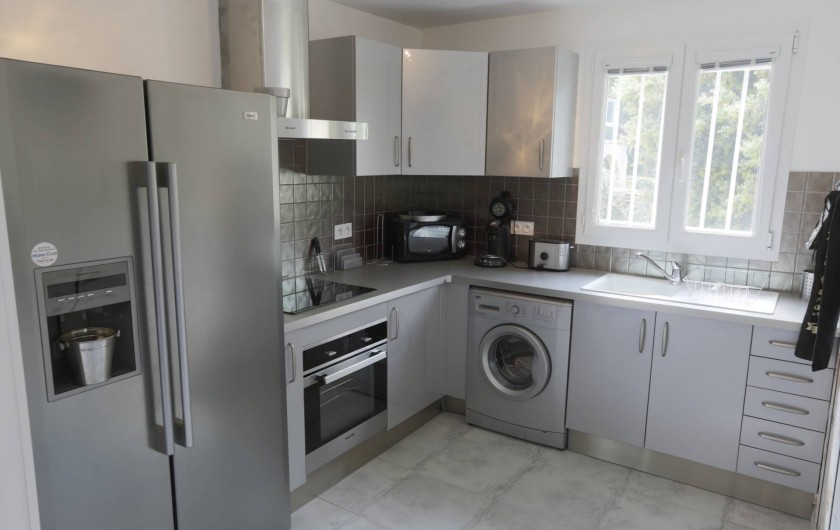 Une cuisine équipée , plaque électrique, hotte, four, frigo américain, lave linge, micro onde, cafetière, grille pain, vaisselle en conséquence,