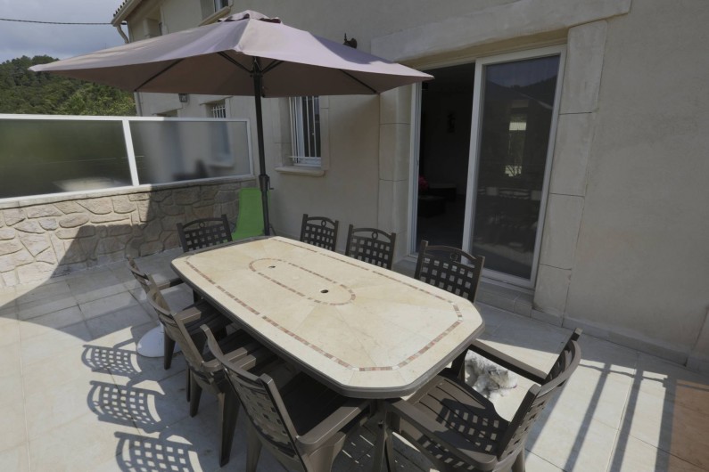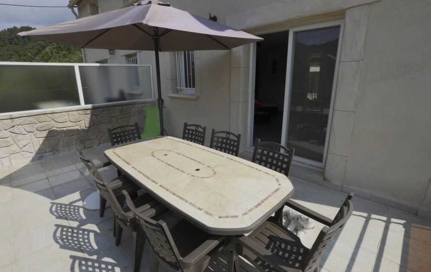 Une terrasse vue sur la vallée, table, fauteuils, parasols, chaises longues
