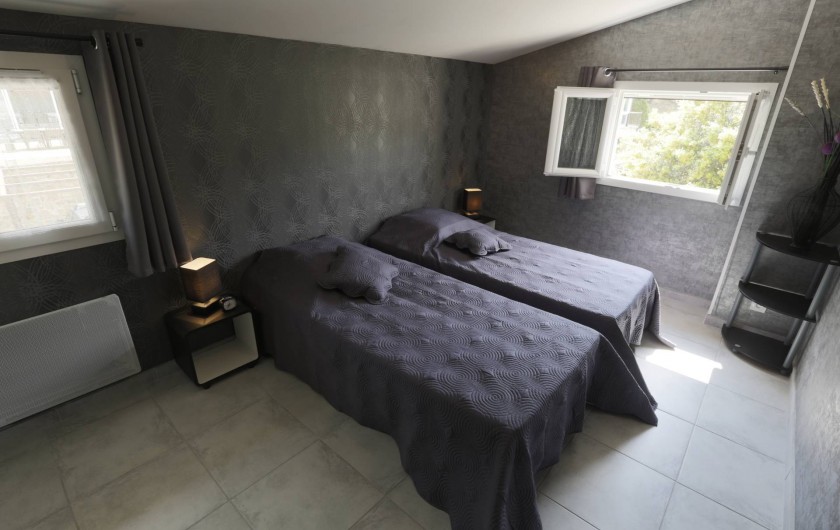 A l'étage : Une première chambre très lumineuse, 2 lits de 90, chevets, lames de chevets, fauteuil, enfilade, une grande penderie/placard
