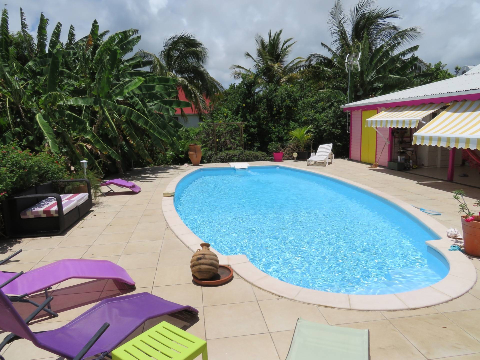 Votre bungalow est placé au cœur d'un jardin tropical entièrement clos (portail électrique – parking privé) avec une grande piscine chauffée (11m × 5m) à disposition.