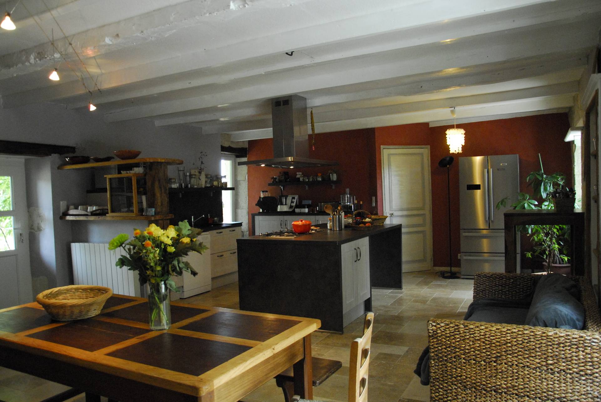Grande pièce à vivre avec cuisine, ilot central, coin détente et grande terrasse.