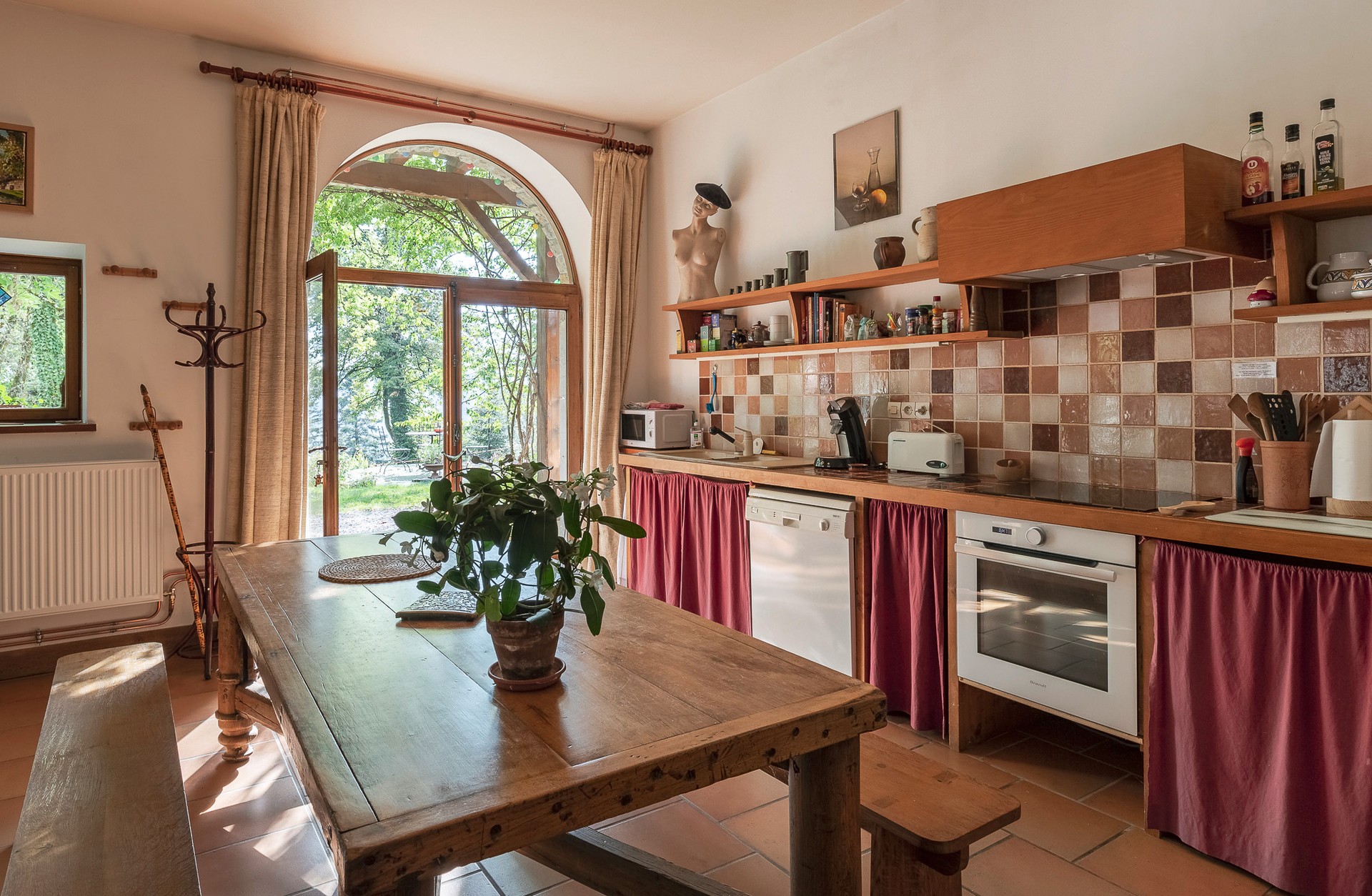 Table ombragée, barbecue, chaises longues et hamac vous attendent au jardin et sur une terrasse/solarium offrant une vue à 180° sur la combe et la forêt.