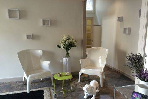 Le salon, reposant, en lin et plume s'illumine sous un lustre de Ross Lovegrove. Le reste du gîte n'est pas en reste puisque on retrouve égalemet du Starck dans la salle de bain et bien d'autres noms sont encore à découvrir comme Claudio Dondoli,