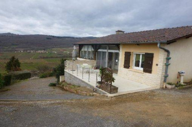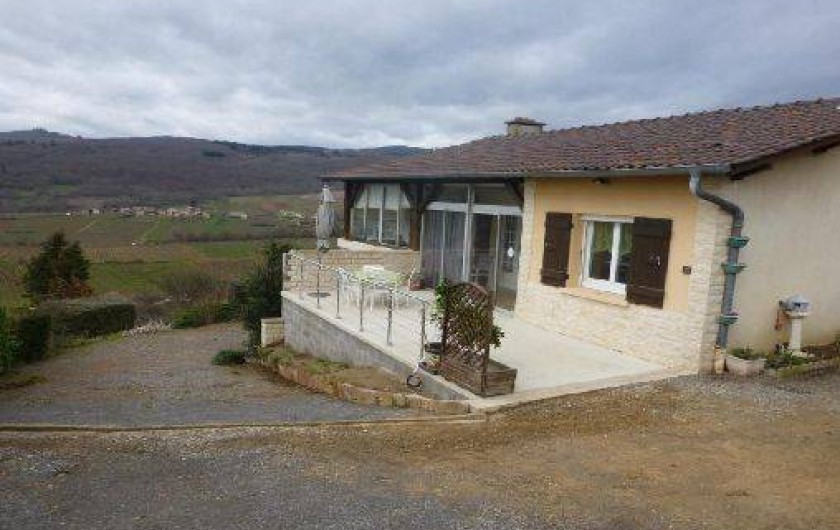 Perchée sur les hauteurs de Leynes, village viticole situé à 15 min de Mâcon, cette maison isolée, très au calme, profite d'une vue dégagée superbe sur les vignes, la forêt, le village et son château... La terrasse de 20m², qui surplombe ce paysage, vous permettra d'apprécier l'environnement et le panorama durant vos repas estivaux. A l'intérieur (de plain-pied) : séjour avec coin salon (TV écran plat, lecteur DVD, convertible pour 1 personne supplémentaire) et coin salle à manger, cuisine équipée, 2 chambres (1 lit 140cm et 2 lits 90cm), salle de bains et wc indépendants. … Terrain 2500m² non clos (très en pente). Sentiers de randonnée au départ du gîte. Linge de lit et linge de toilette fournis gracieusement. Chauffage fioul également inclus aux tarifs. Lit bébé et chaise haute sur demande. Lire moins Lire la suite