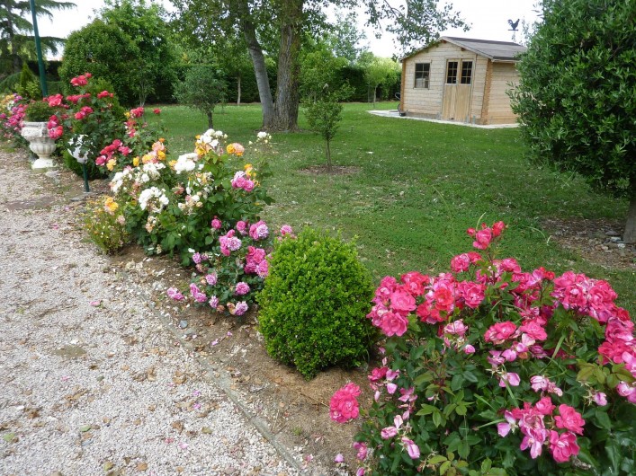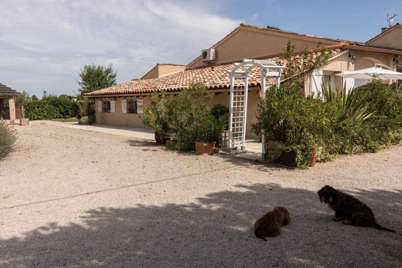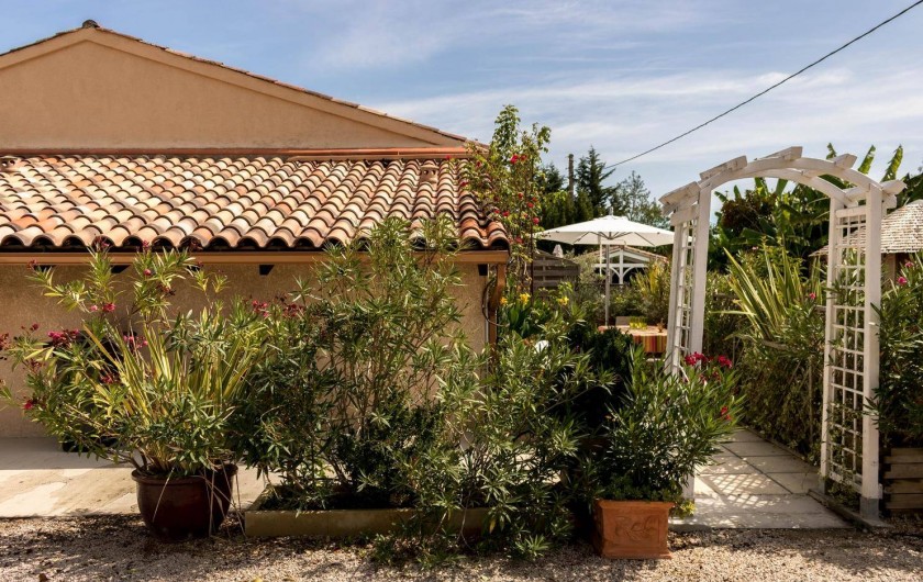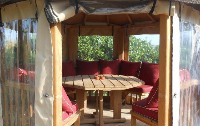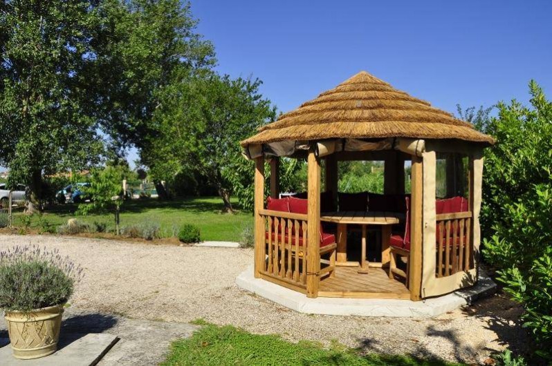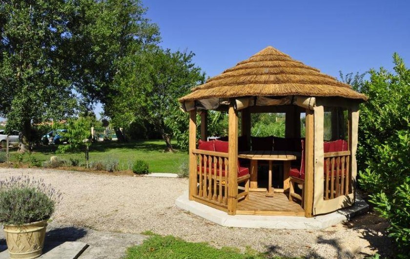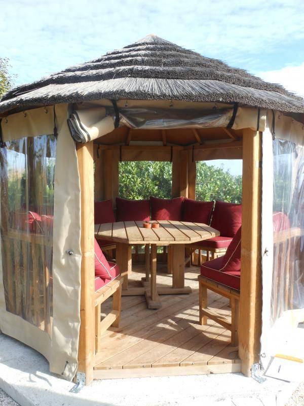 Vous disposez d'une terrasses privative devant le Gîte avec table et chaises d'extérieur, avec barbecue sur roulettes, chaises longues, parasol, avec supplément 1 paillote extérieure de 9 m² indépendante équipée d'une table octogonale avec sièges et coussins confortables pour 8 personnes, fermetures réglables et transparentes, vastes pelouses ombragées, avec votre stationnement privé devant le Gîte. Votre gîte est dans une maisonnette indépendante séparée de l'habitation principale.
