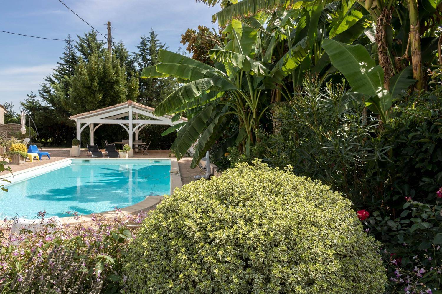 Grande Piscine commune de 13 x 5 m avec accès en gradins profondeur maxi 1.75 m, accès libre sans contrainte d’horaire. Entourée de grandes et petites terrasses avec chaises longues et fauteuils. Autour de beaux bananiers, de nombreux canas multicolores et de magnifiques rosiers, lavandes, lauriers rose et blancs, iris, arbres fruitiers ,pour profiter du soleil en plein air et de la belle nature environnante, vue sur la campagne et sur la chaîne des Pyrénées par beau temps.