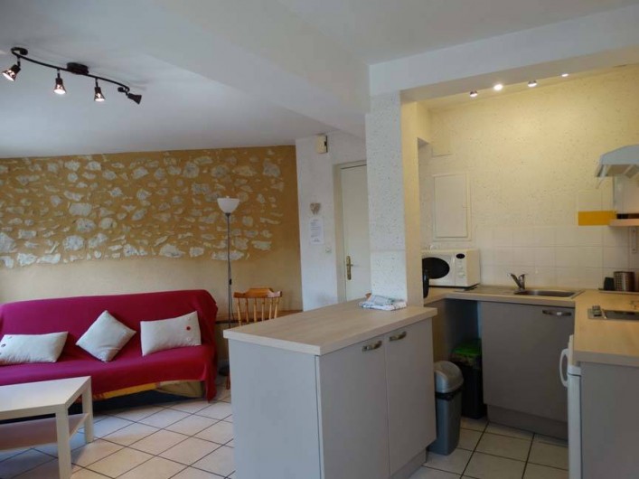 une cuisine américaine équipée (frigo, cuisinière, plaque induction, micro ondes)