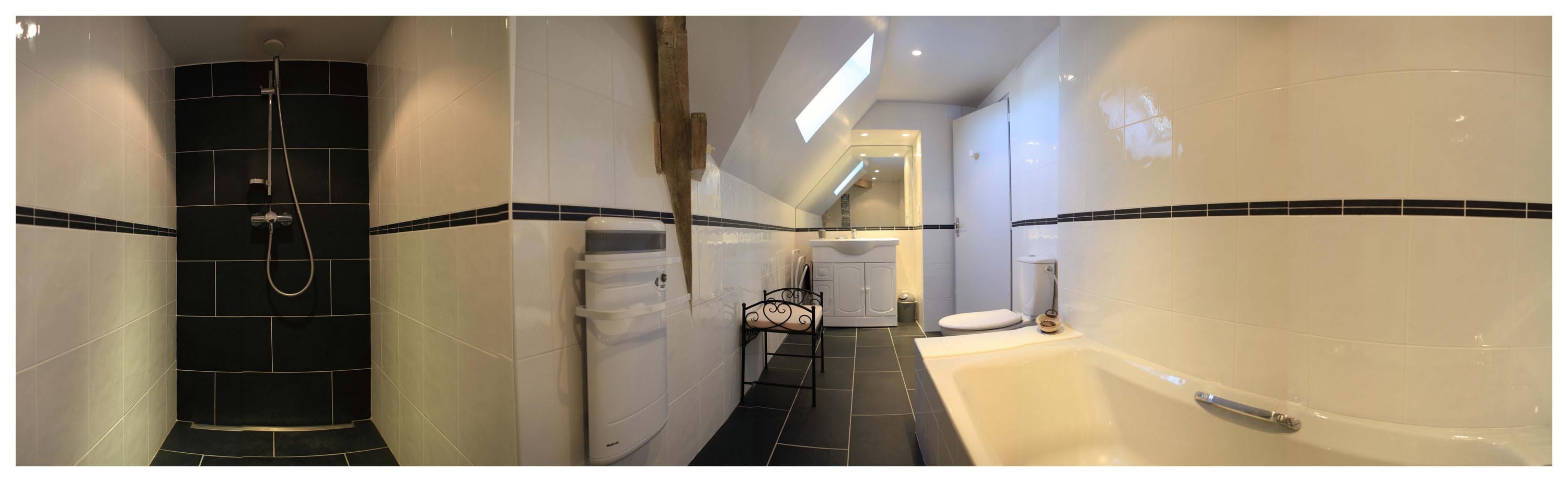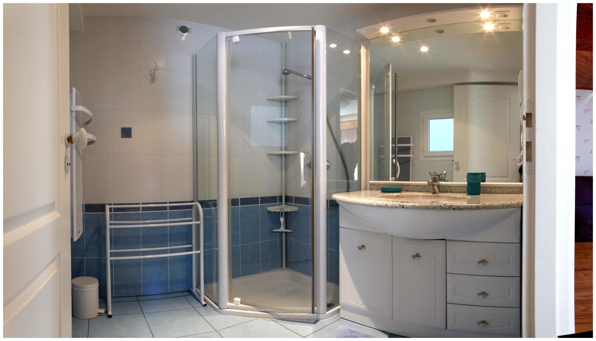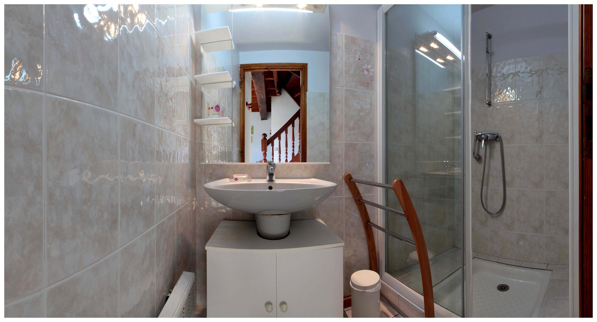 - Salle de bains avec douche et lavabo, ainsi qu'un sèche-cheveux.