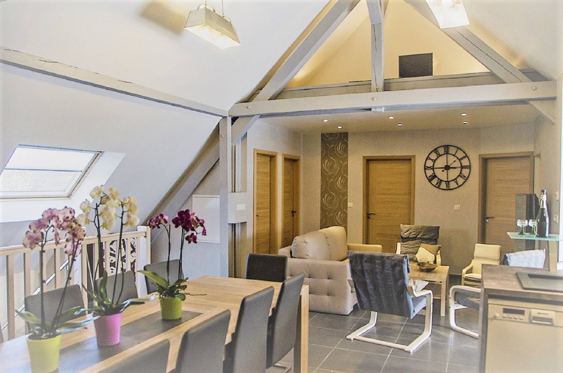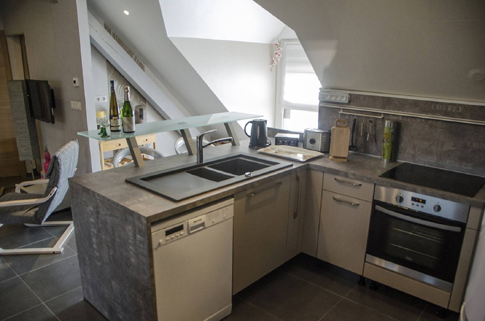 Gîte au 1er étage d'une dépendance construite il y a plus de 100 ans et rénové en 2014. Situé à proximité de la maison des propriétaires, dans un domaine de 2 hectares, avec verger et forêt traversée par un ruisseau, au cœur d'un petit village, au pied du vignoble alsacien. Entrée indépendante avec possibilité de stockage vélo/ski. Une pièce à vivre, (salle à manger, cuisine ouverte, séjour avec canapé convertible pour 2 personnes (matelas latex), fauteuils, télé 82cm, DVD, wifi. 3 chambres (ch1: 1 lit 140x190, ch2: 1 lit 90x190 et 2 lits 80x200 transformable en lit