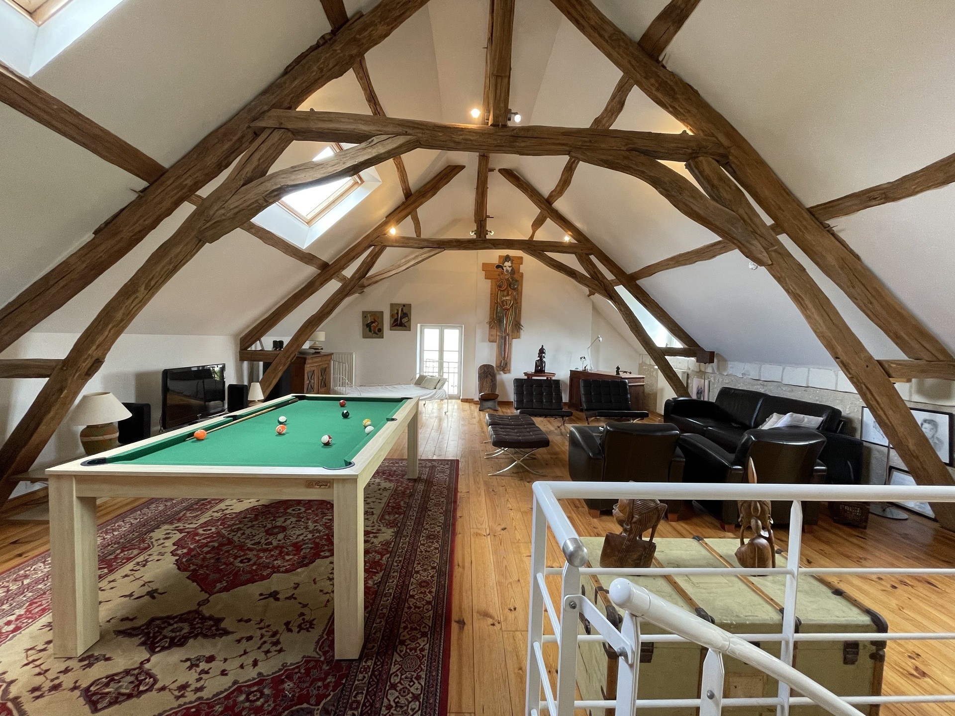 • A l'étage, un grand salon de 70 m² agréablement meublé et décoré sous la charmente orginelle de la maison. Il est équipé d’un écran LCD, lecteur DVD et chaîne hifi. Séparée du salon se trouve une mezzanine avec 1 lit double en 140 et 1 lit simple.