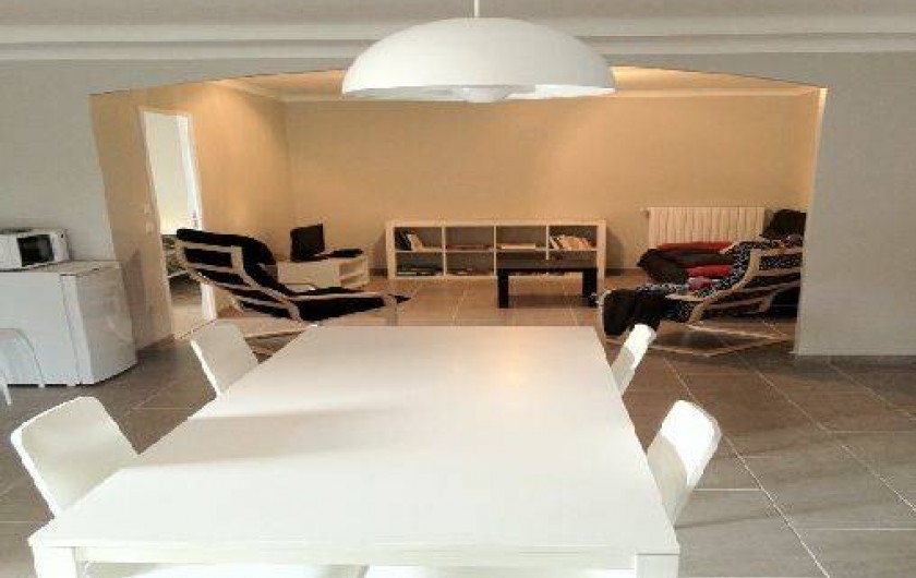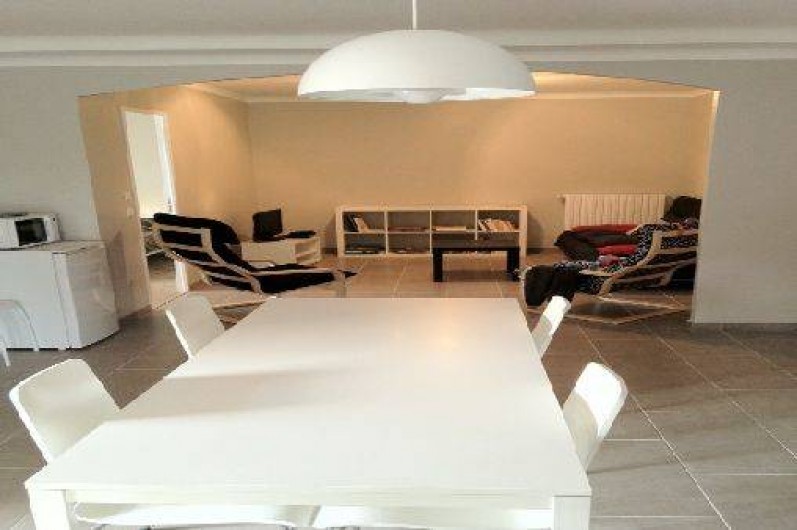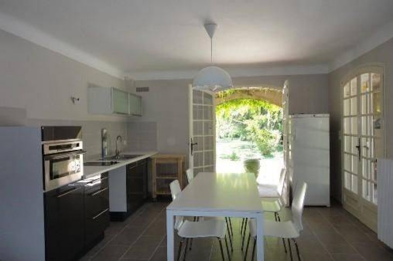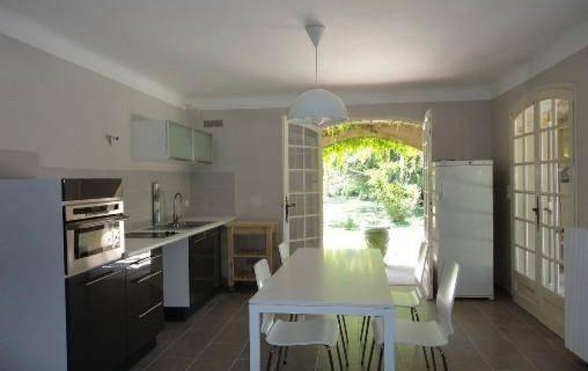 Cuisine spacieuse et très lumineuse, grande table, 4 chaises, 1 tabourets.