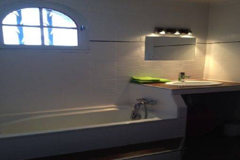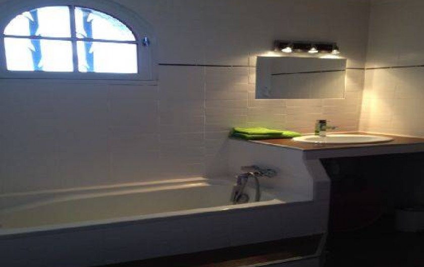 Salle de Bains : baignoire avec paroi de douche, lavabo, grands rangements.