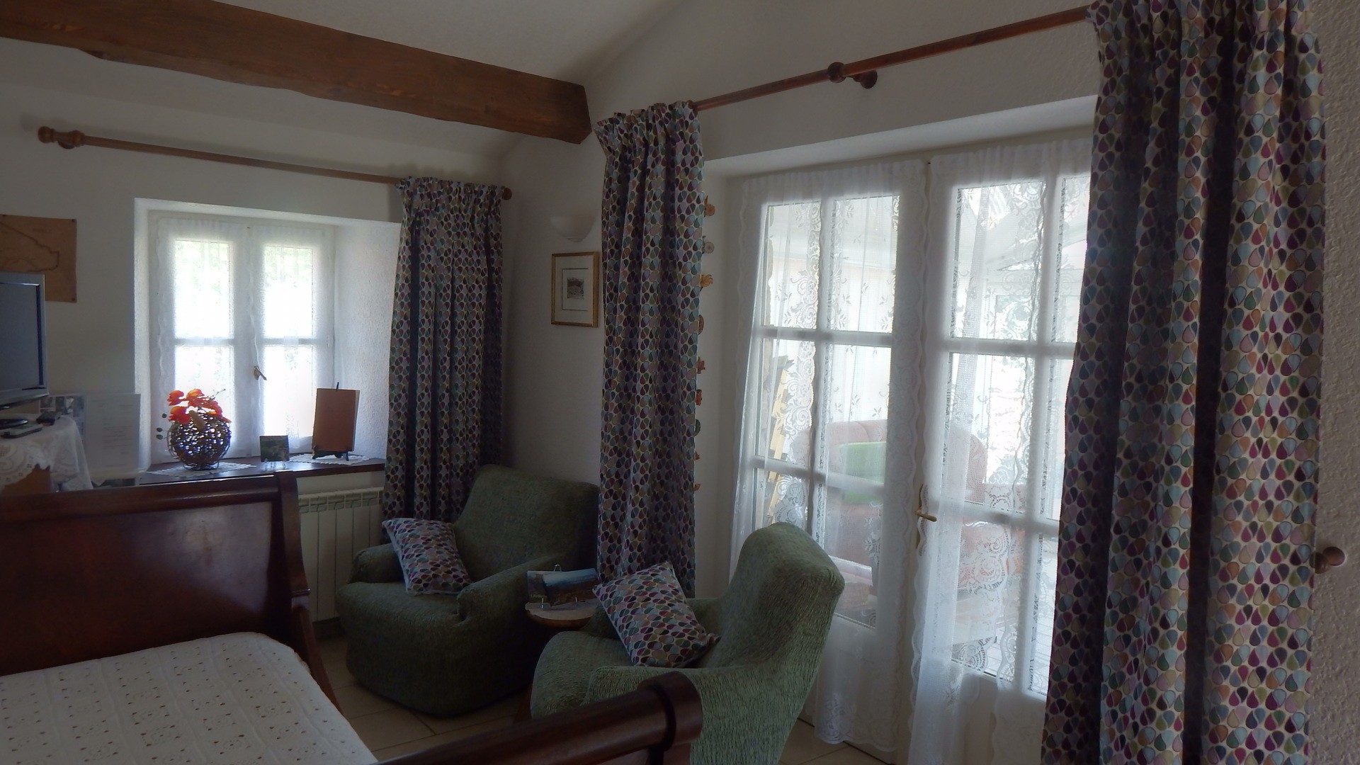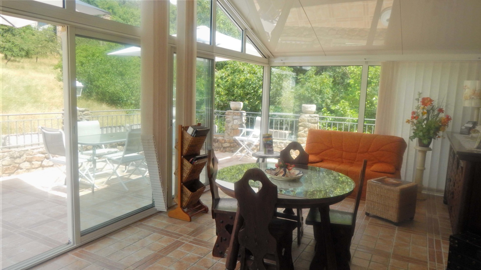 Gîte avec grande véranda (qui fait S.à manger/salon ) équipée de 2 canapés, également une terrasse.