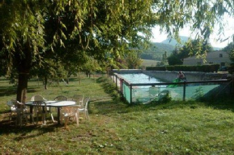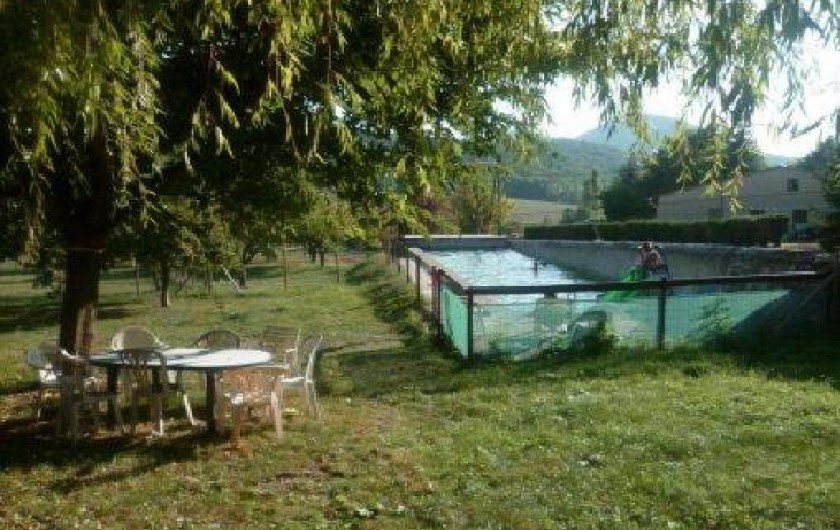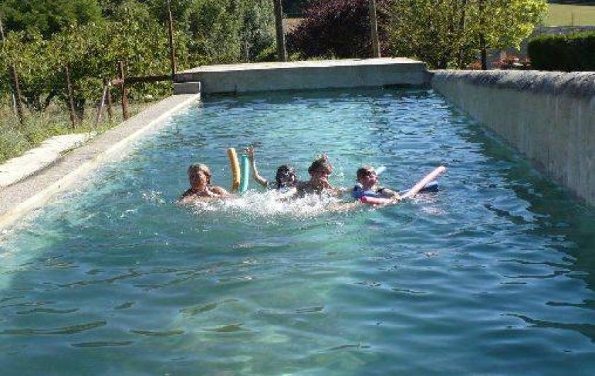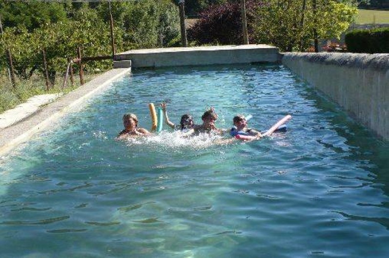 A quelques mètres, vous pourrez vous délassez dans notre longue piscine (4x18 m) entièrement close, sur les chaises longues, au soleil ou à l'ombre du saule pleureur. Vous pourrez aussi jouer au ping-pong. Les enfants trouveront un toboggan dans le jardin.