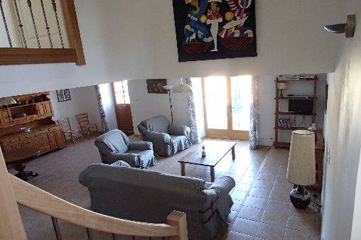 RDC : grand séjour de 7O m² : coin salon avec canapé, fauteuils, bibliothèque et TV lecteur DVD, jeux de société coin repas avec