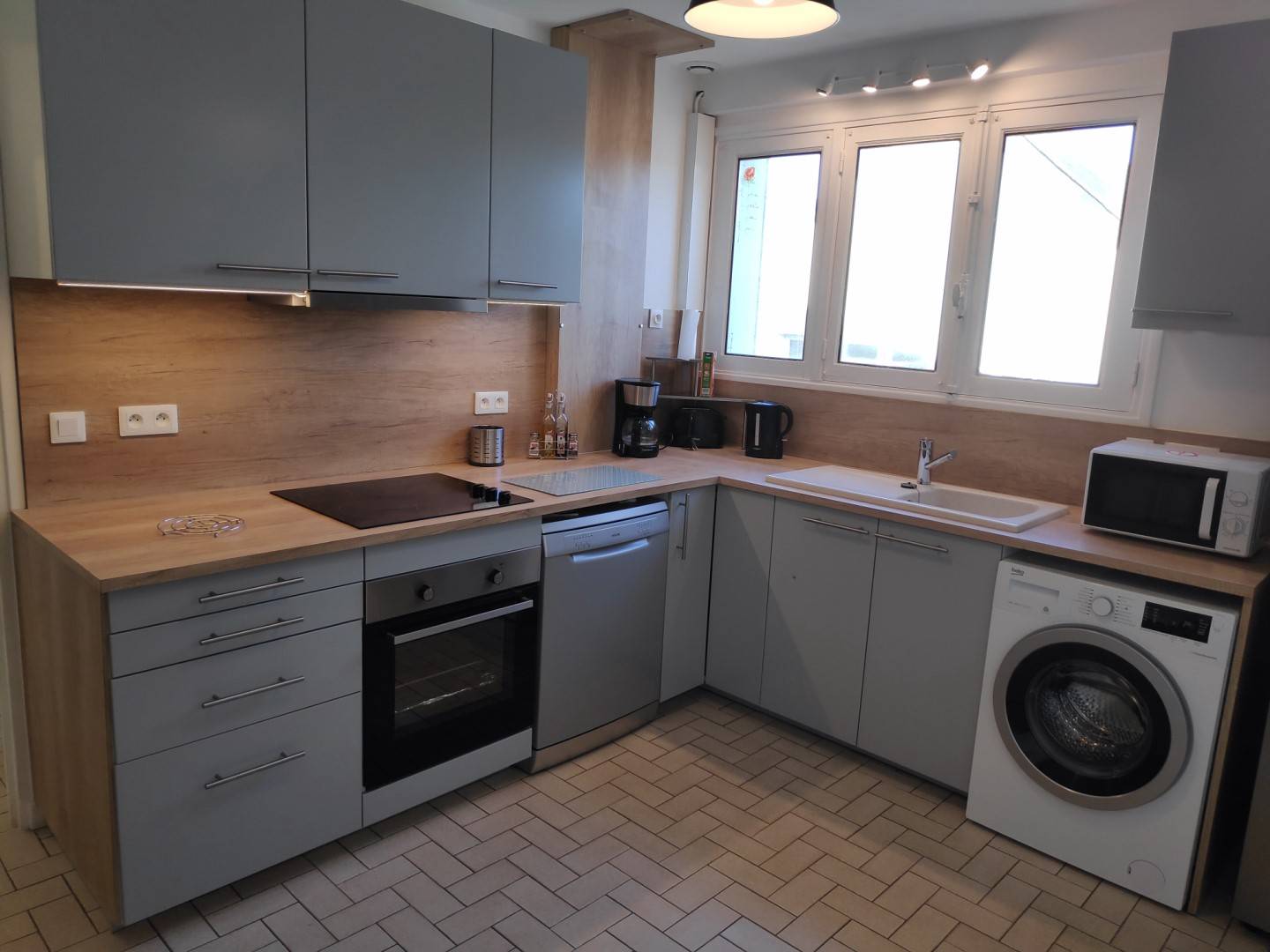 Cuisine équipée, plaque chauffante, four, frigo, Micro-onde, cafetière ,vaisselle, lave linge et lave vaisselles .