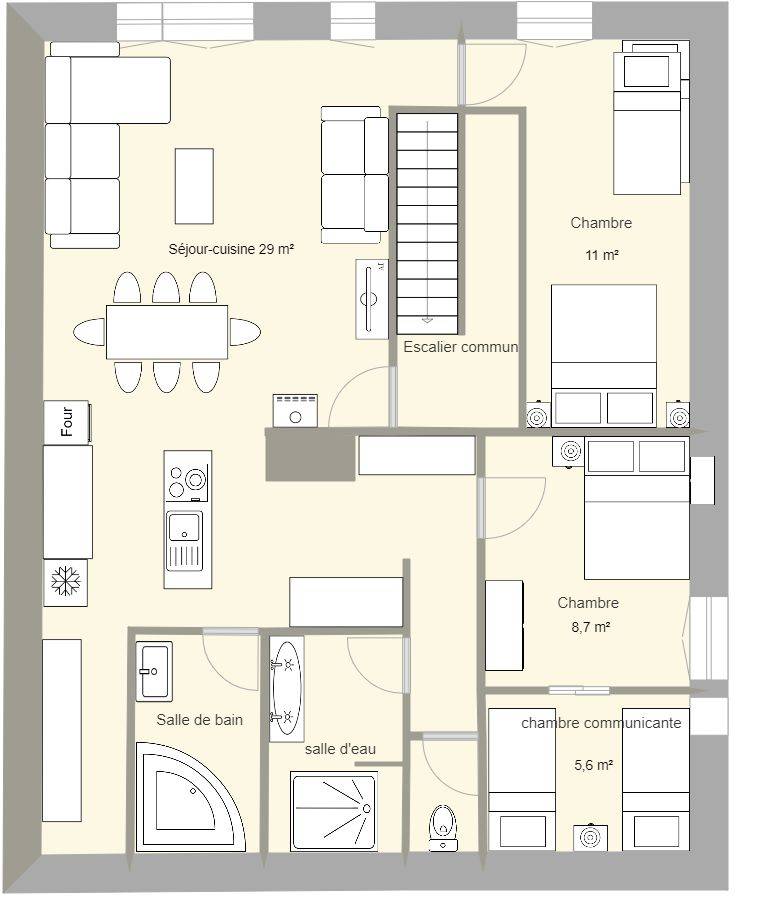 Au 1ER ETG d'une maison de village,une cuisine ouvertes le salon toute équipée, four, plaque, micro onde, cafetière, raclette,une grande table,un frigo et congélateur. Un