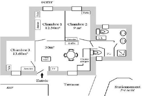 Le gîte de 75 m2 comporte 3 chambres autour d'une grande pièce de vie, 1 salle d'eau avec douche, 2 vasques et WC + 1 WC indépendant. Terrasse d'été et salon de