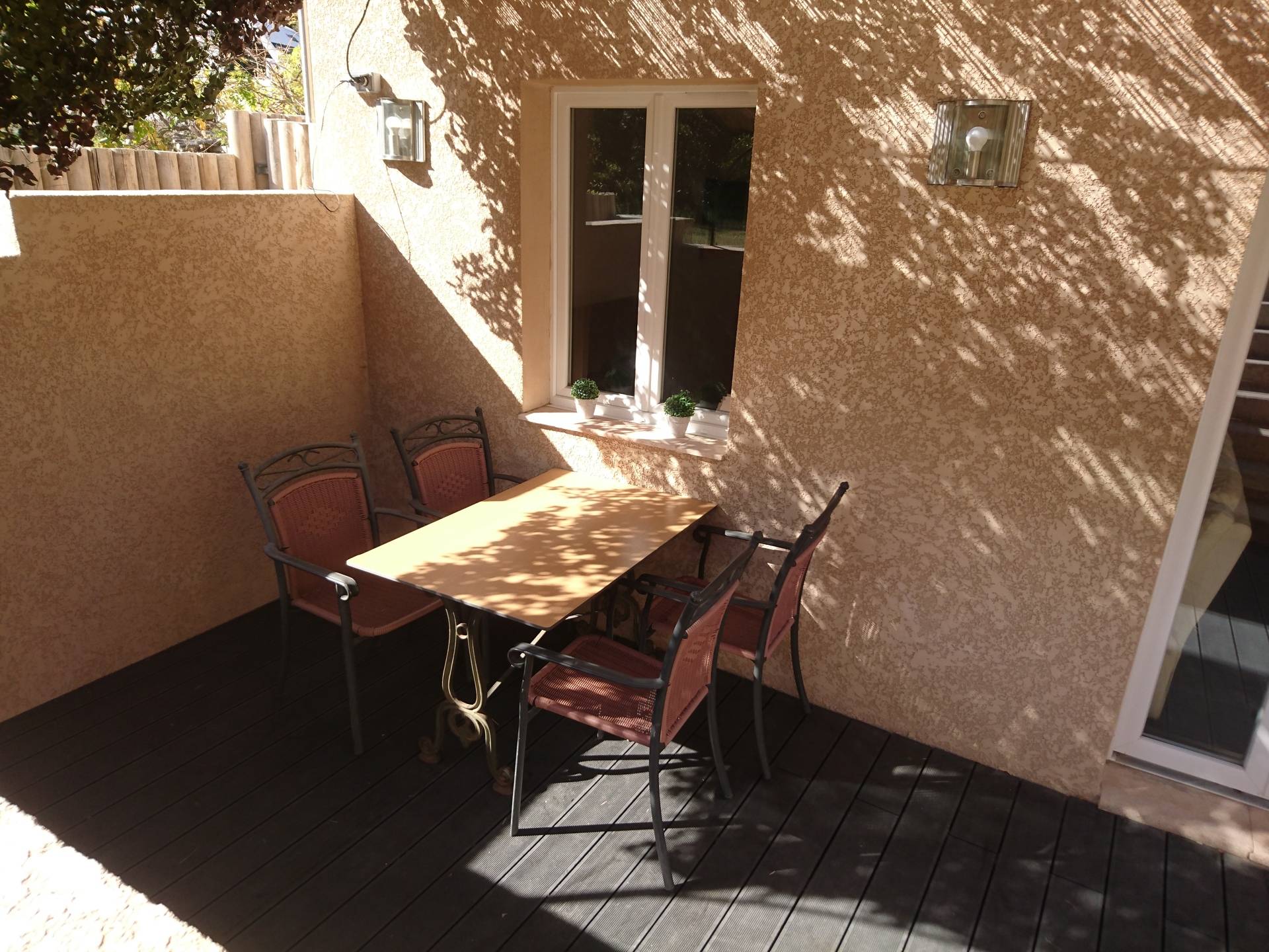 Terrasse privative 16 m2 ombragée par une pergola en fer forgé. L'appartement comprend un séjour / coin cuisine équipée 29 m2 : Cafetière, minifour, grand réfrigérateur, Combiné-congélation, lave vaisselle, un coin salon avec canapé d'angle en cuirs, TV écran plat, lecteur DVD et USB, Wifi. Deux chambres indépendantes de 10 m2, lit baldaquin en 180, 2 lits en 80 jumelables. Salle d'eau avec douche italienne, sèche serviette programmable. WC indépendant.