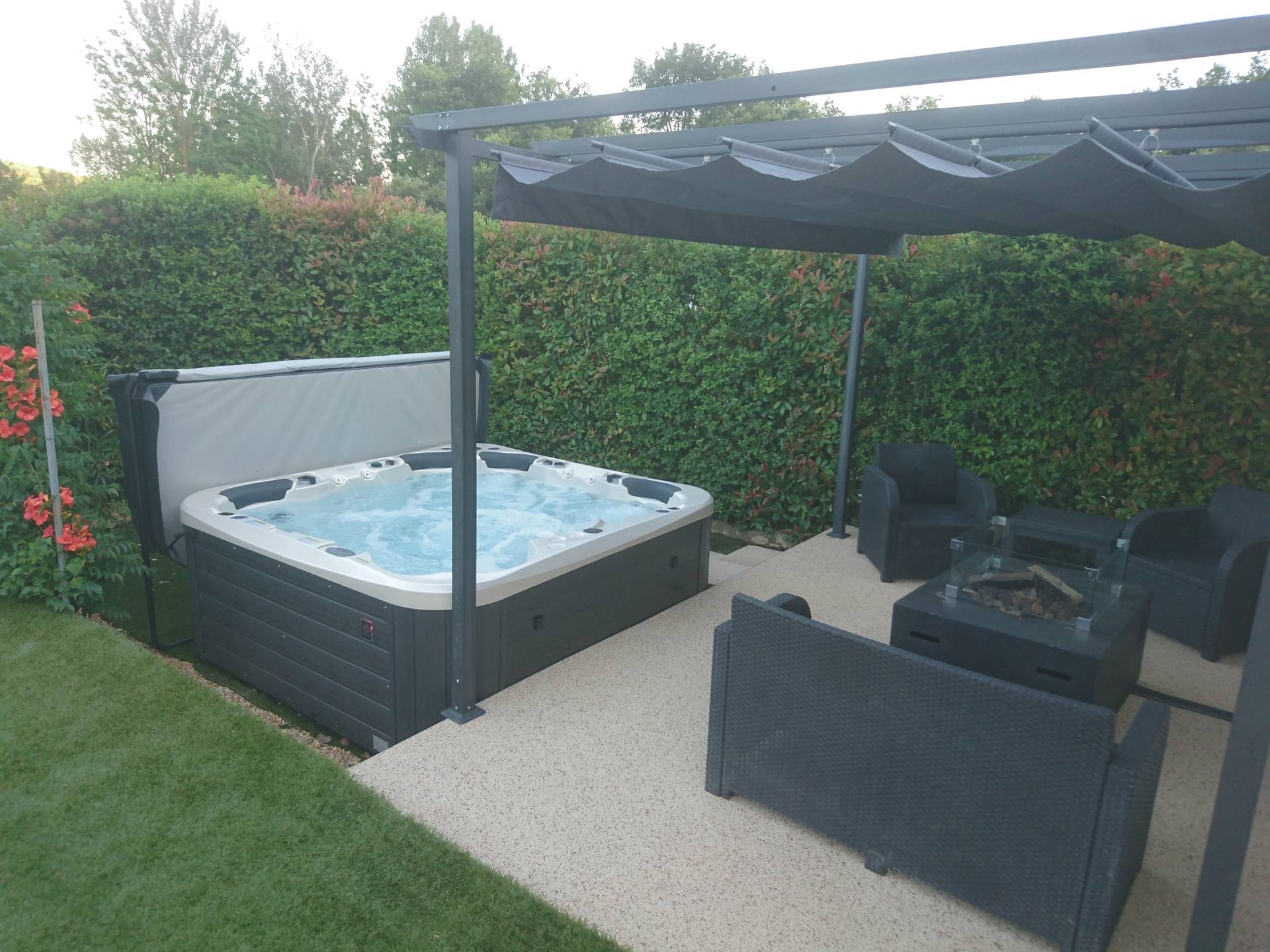 Accès à la maison sécurisé avec portail électrique. Piscine, spa et salon de jardin à partager avec les
