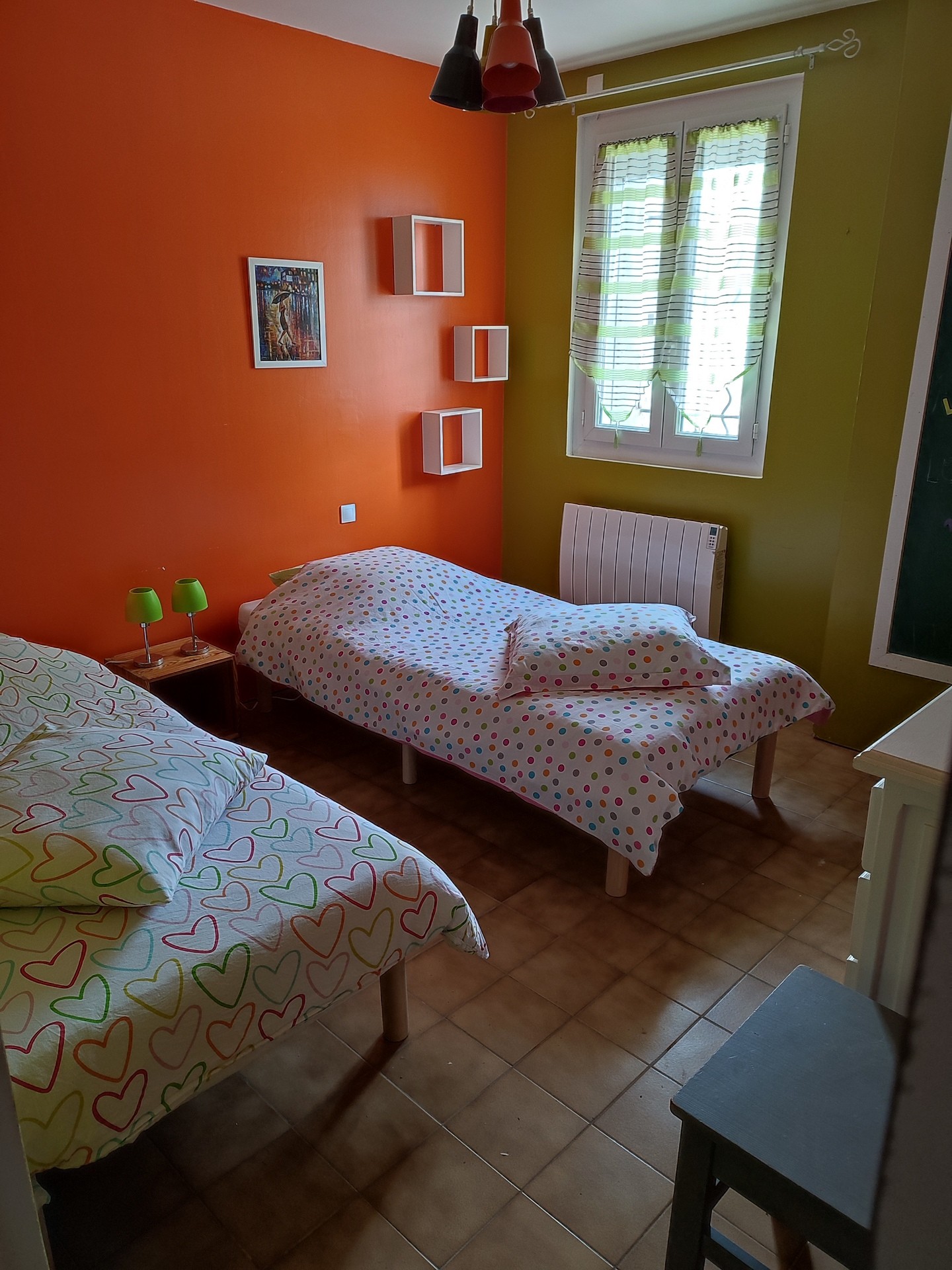 - Une chambre avec 2 lits simples de 90 x 190 (Draps, couettes, oreillers)
