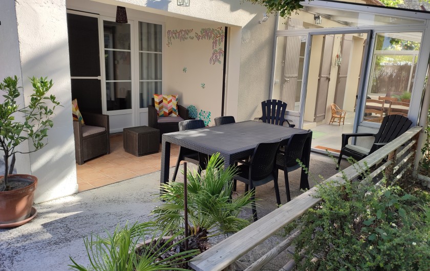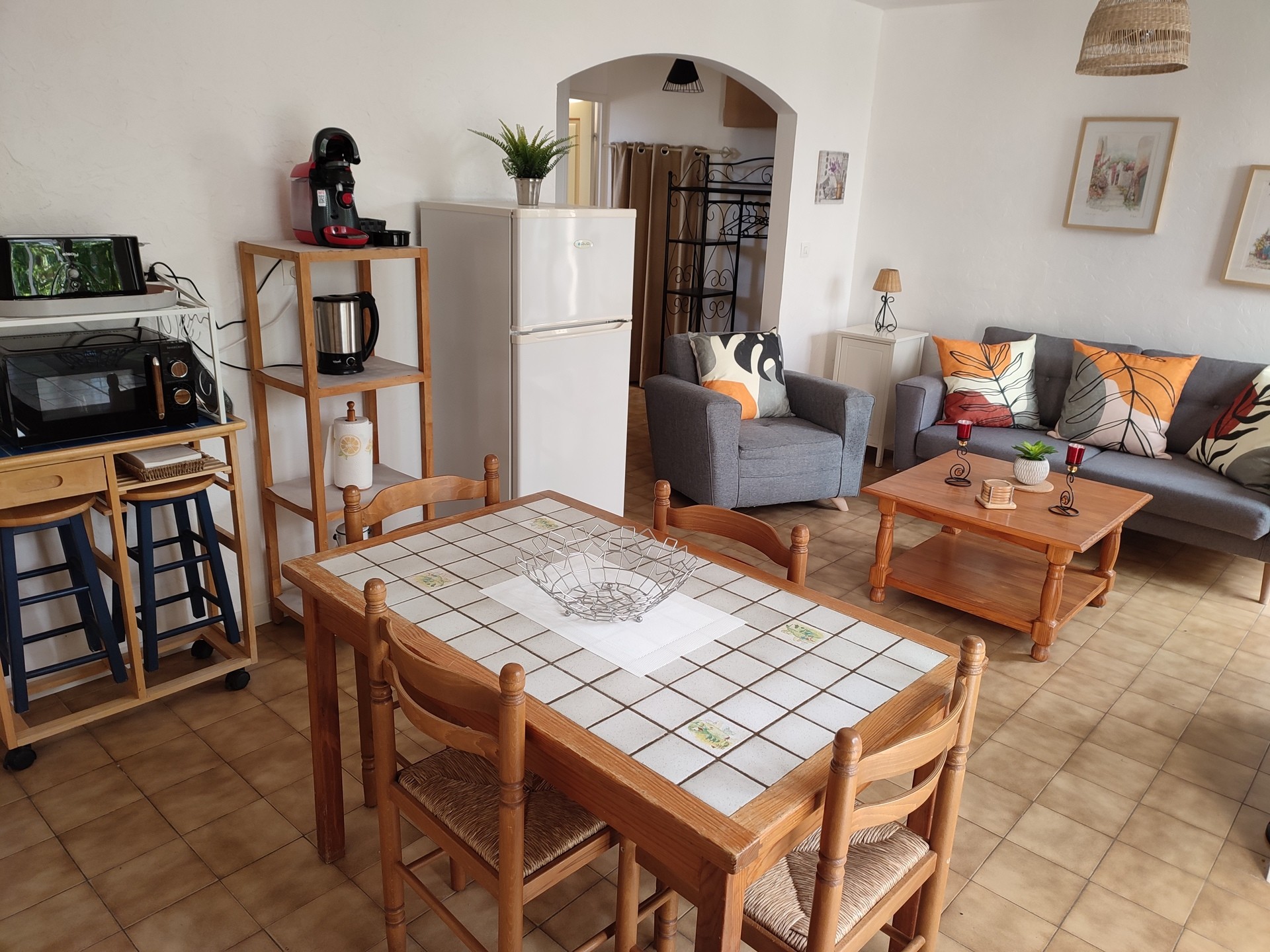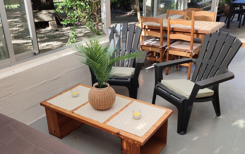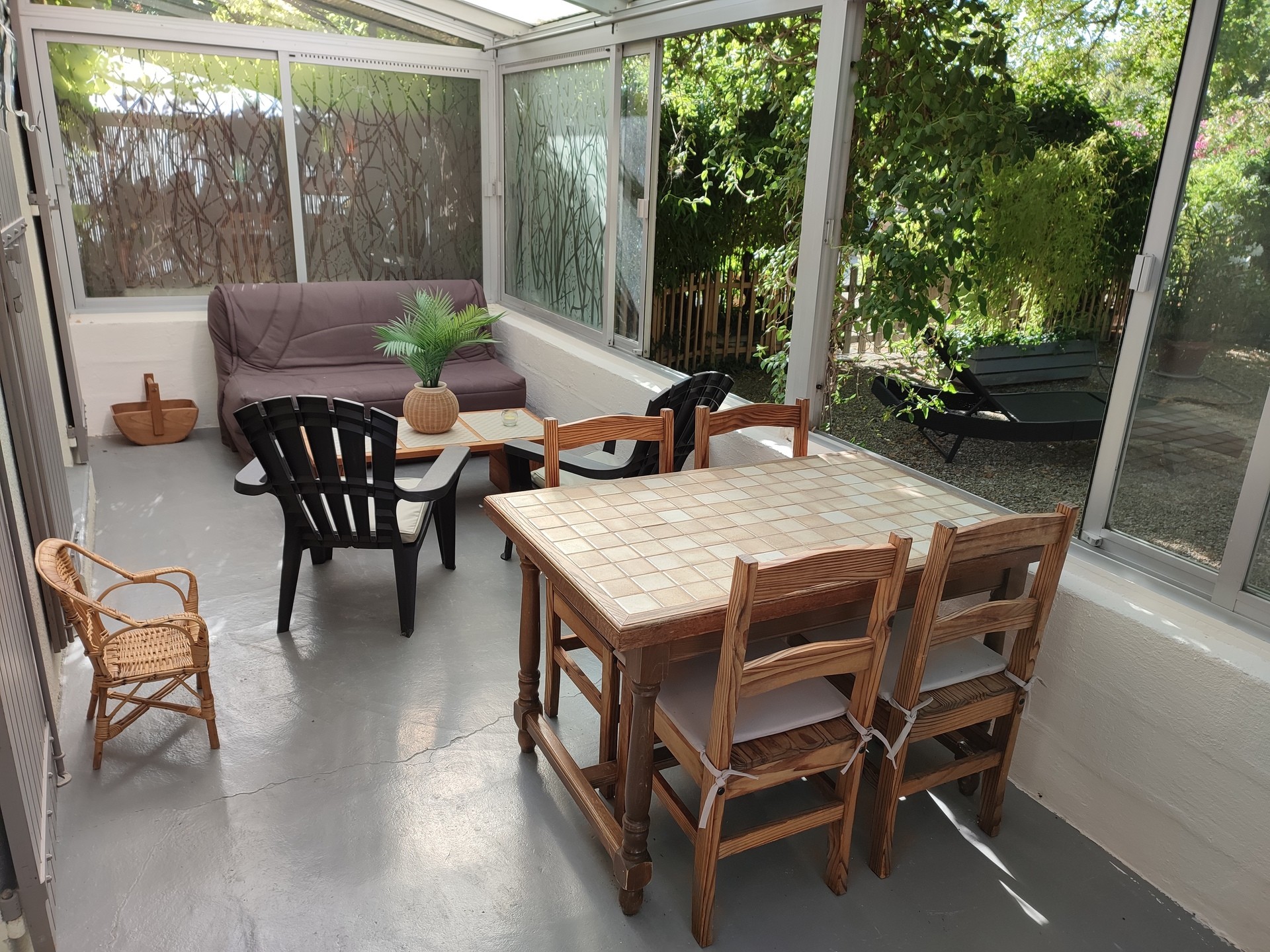 - Équipement : Cafetière Tassimo, cafetière 12 tasses, bouilloire, grille-pain, micro-ondes, frigo-congélateur, canapé, télé, radio, fer et table à repasser, barbecue, plancha, transats, salon de jardin, abri vélo fermé à clé, véranda avec table chaises et salon détente, terrasse couverte avec petit salon devant chambre parentale