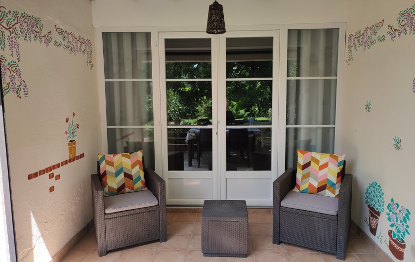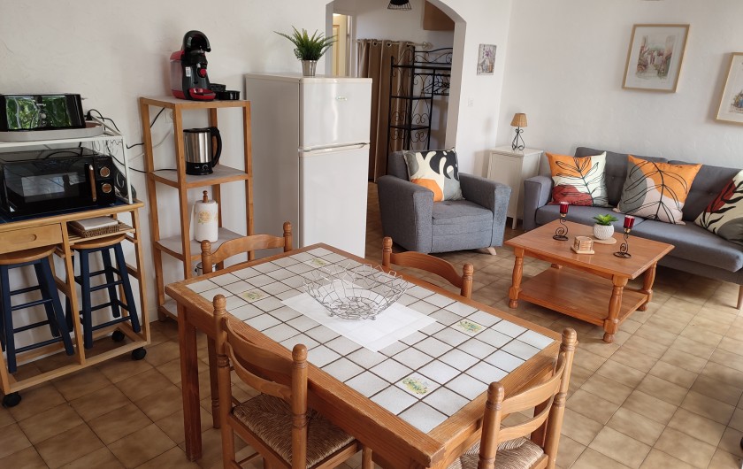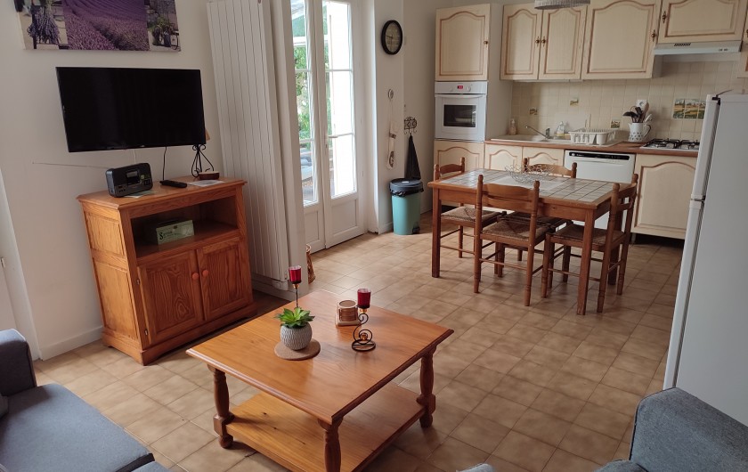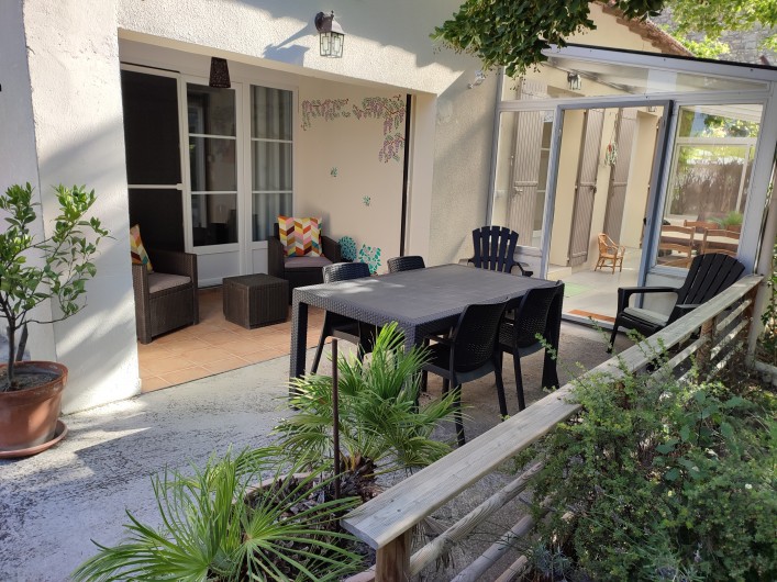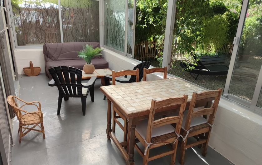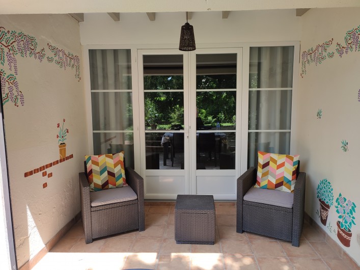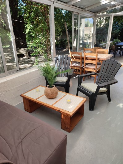 - Le gîte : Cuisine ouverte sur salon donnant sur la véranda, 2 chambres, salle d'eau, wc séparé