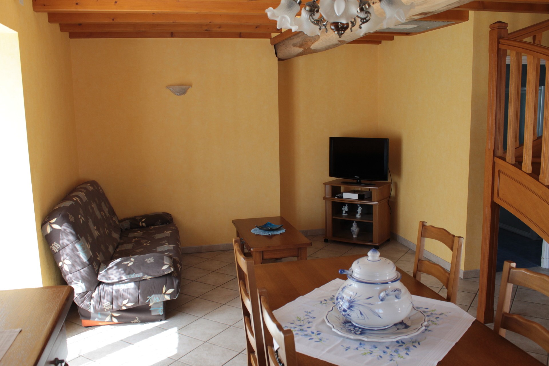 Au rez-de-chaussée se trouve la cuisine, la salle à manger avec son coin salon ainsi qu'une salle de bain avec douche et un cellier. Les poutres apparentes ainsi que le mobilier rustique et l'escalier en chêne rendent cet étage très chaleureux. La porte fenêtre donne sur la terrasse et fait entrer la lumière dans toute la pièce.