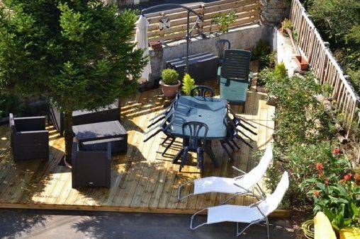 Cour avec salon de jardin et barbecue.2 kayaks de 2 pers. avec gilets.