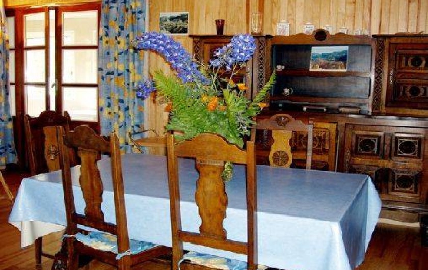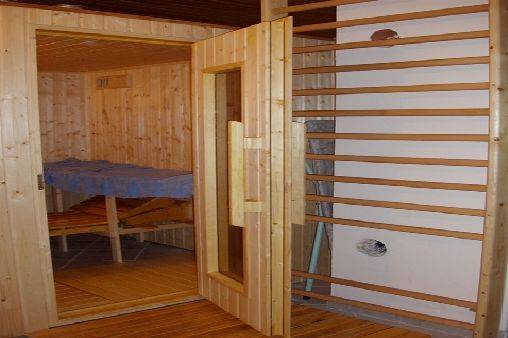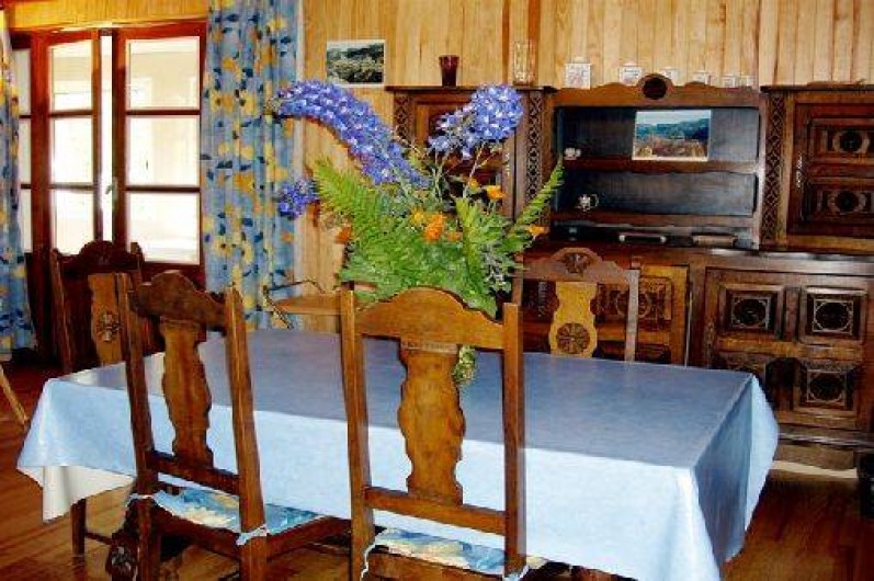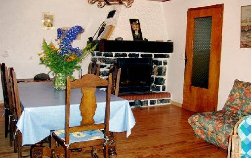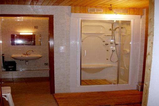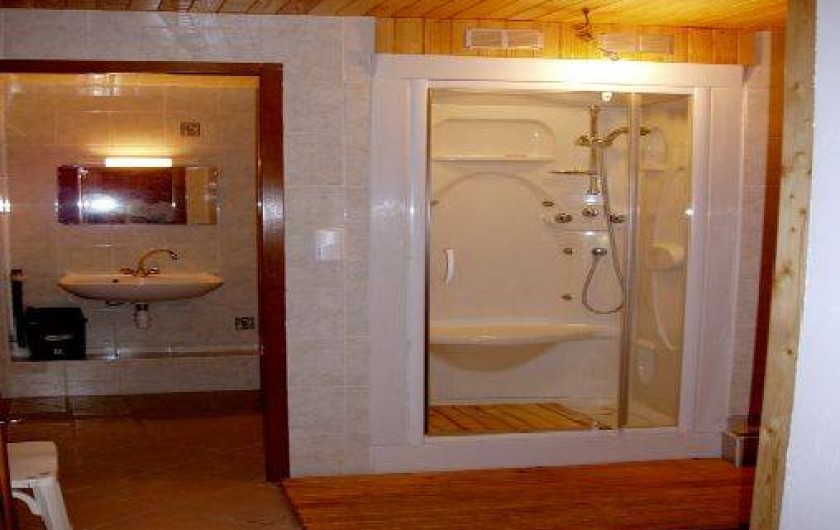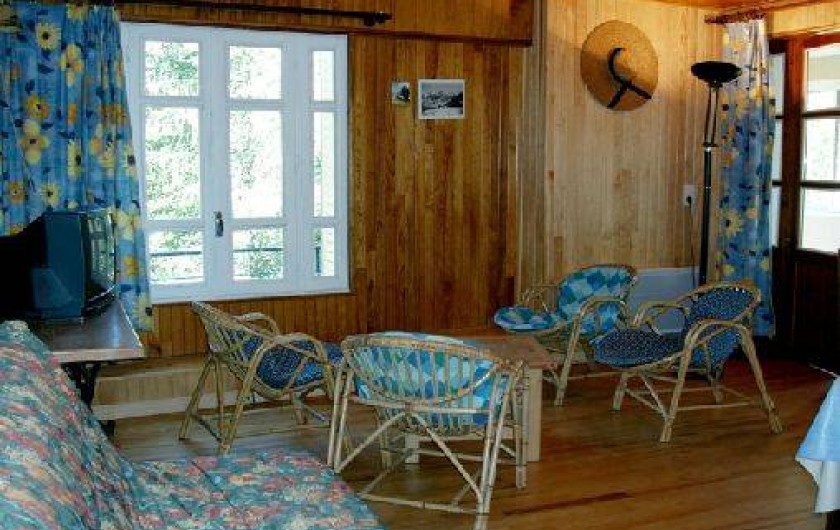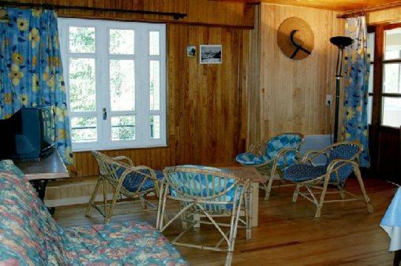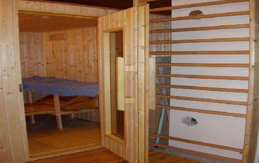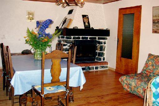places, un coin toilette, un lave-linge, une douche hydro-massante et un sauna. Le rez-de-chaussée accueille une entrée, une cuisine toute équipée (lave vaisselle, cuisinière, frigo avec compartiment congélateur, micro-ondes, cafetière, grille pain), un salon / salle à manger avec cheminée et télévision, une véranda, une salle de bain, des toilettes, une chambre avec un lit deux places, une autre avec un lit deux places et deux lits superposés. La relation rez-de-jardin et rez-de-chaussée se fait par un escalier extérieur.