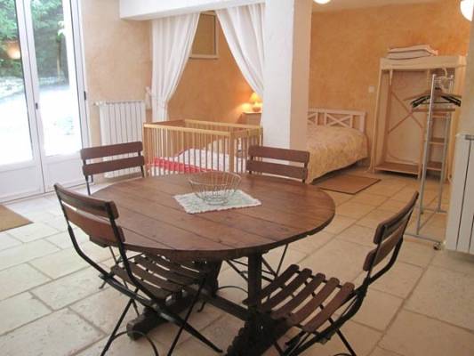 A l'entresol (accès par le séjour par escalier de meunier ou par l'extérieur) studio 50 m2 avec 1 lit en 140, 1 lit bébé, petit espace avec 2 lits superposés, salle d'eau (2 douches séparées, lave-linge), WC, coin cuisine équipée, coin salon (TV). Draps fournis. Location linge de maison et de toilette. Téléphone Téléséjour. Chauffage fuel.