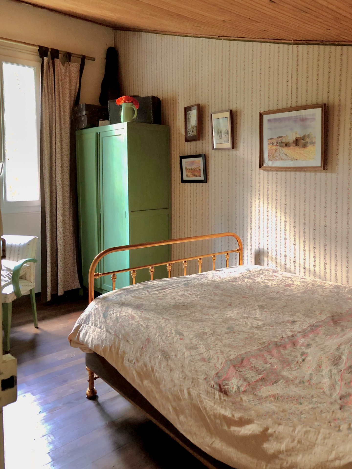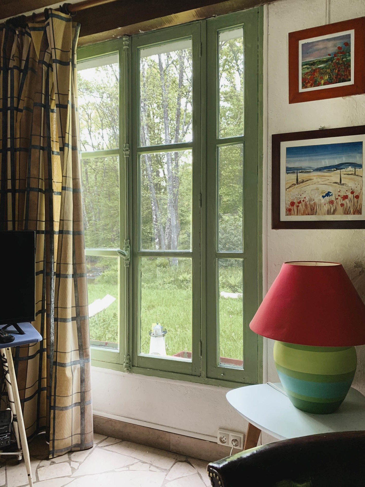 A l'étage mezzanine 3 jolies chambres ,vue sur la rivière, lits doubles , avec matelas confortables, armoire , bureau et fauteuil , le soir seul le bruit de l'eau vous berce et vous apporte un sommeil réparateur.