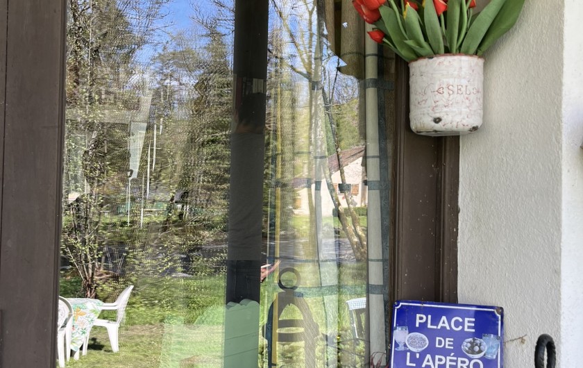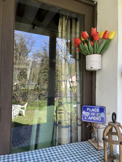 terrasse, composée d'un espace repas avec sa grande table et ses 8 chaises, d'un coin lecture, salon, petite bibliothèque , jeux de société .