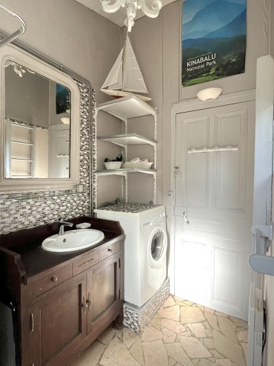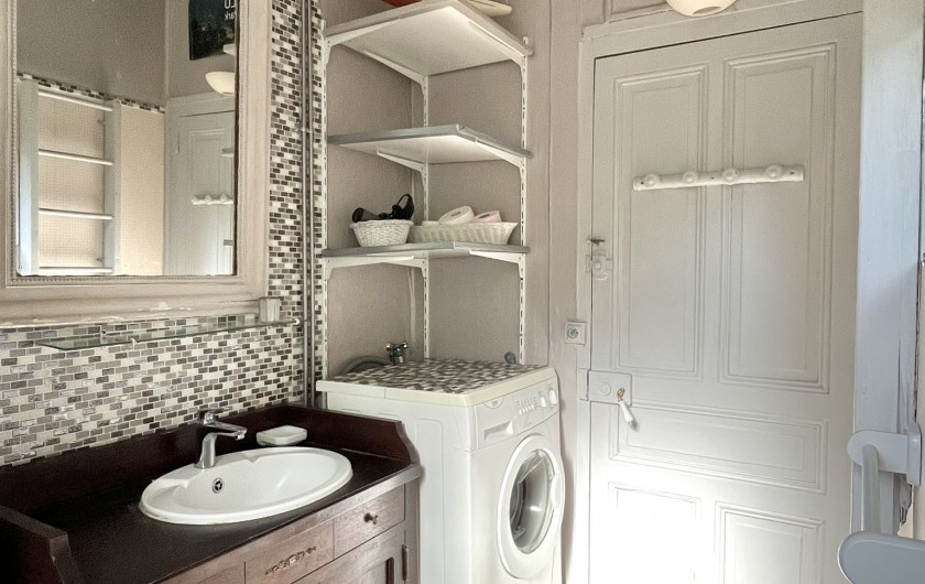 Salle de bains, toilette, douche lave linge. étagères de rangement.