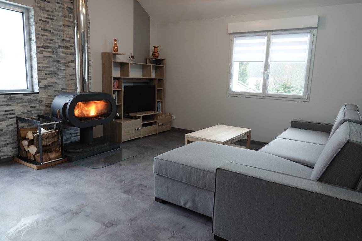 - 1 pièce à vivre spacieuse avec cheminée, salon, salle à manger (canapé convertible, TV …), coin repas