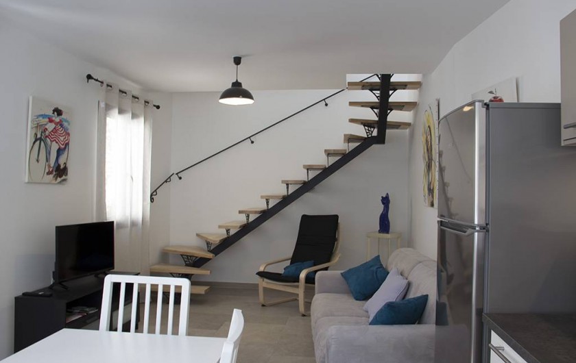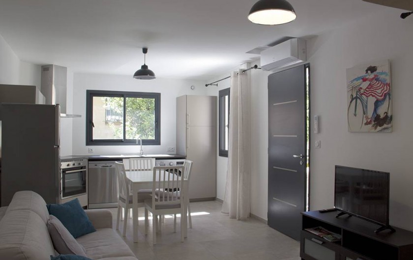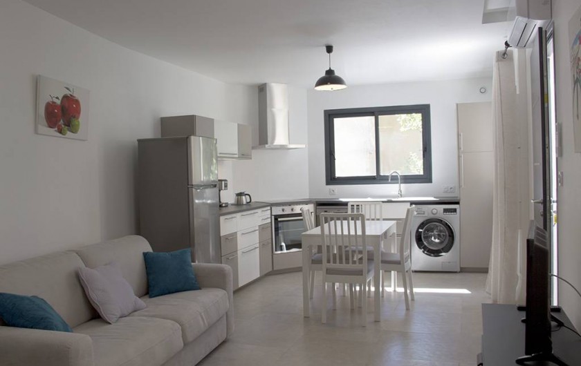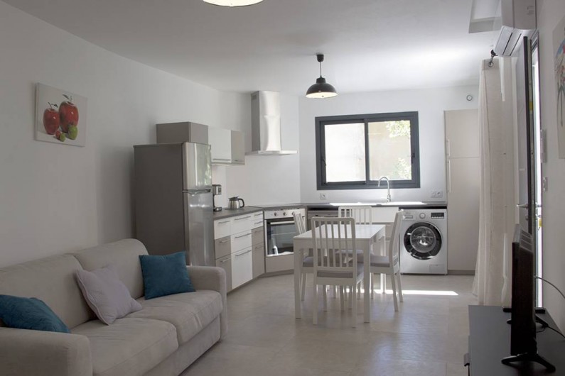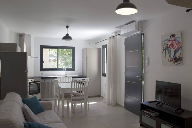 Une cuisine ouverte entièrement équipée, un salon, avec canapé convertible d'excellente qualité. Une TV , un accès internet par wifi.