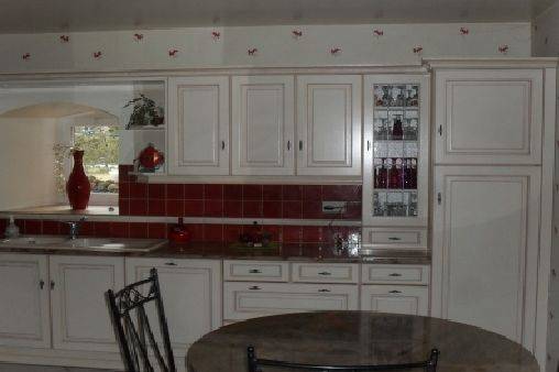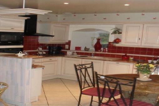 Au rez de chaussée, pièce à vivre de 50 m2 avec cuisine moderne équipée (lave- vaisselle inclus), ouverte sur salle à manger et sa table de ferme, le cantou et son poêle à bois, salon, canapé et TV.