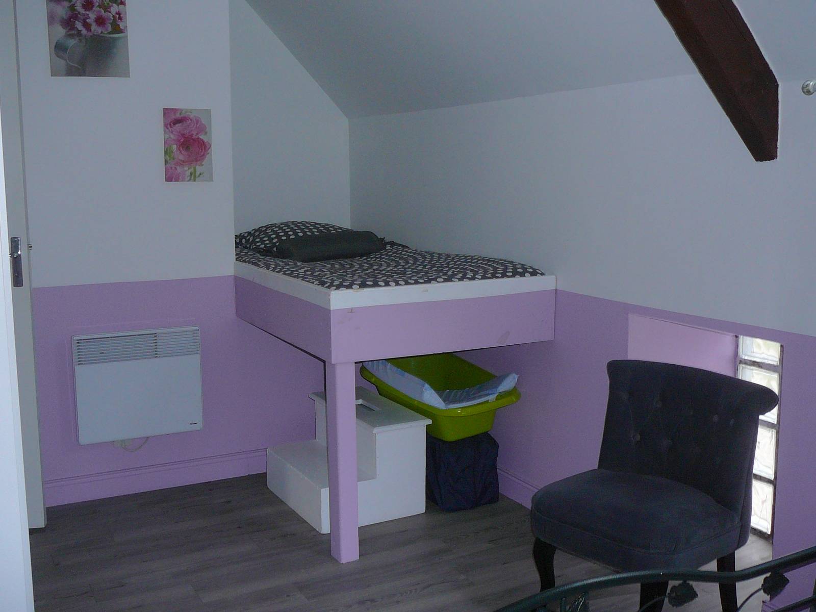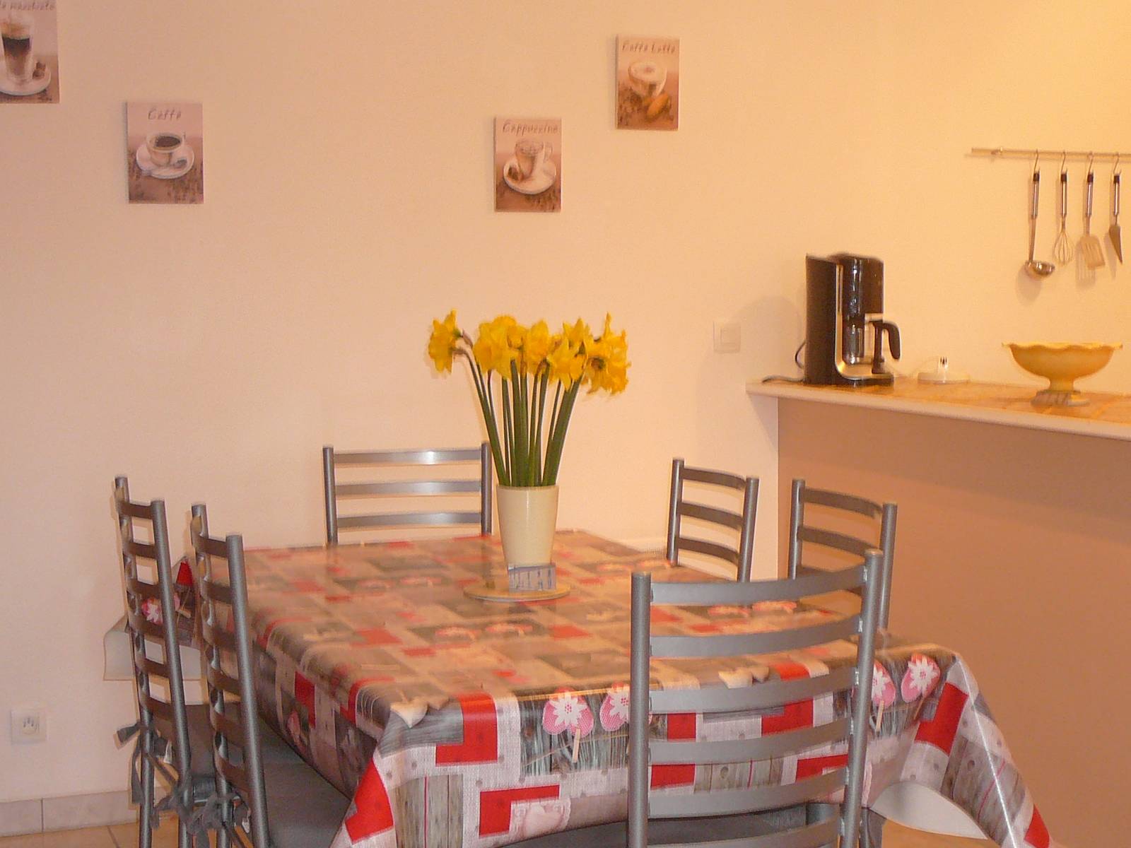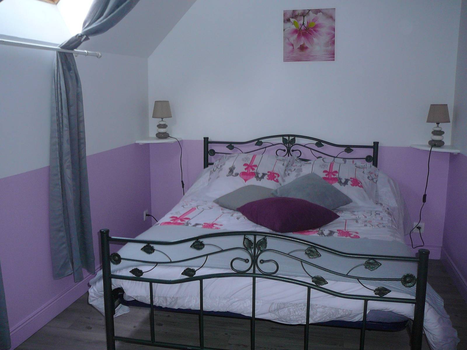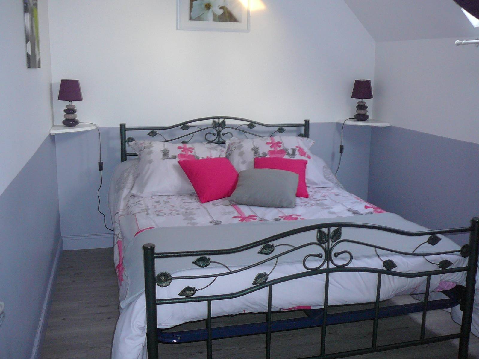 Gîte mitoyen à l'habitation des propriétaires. R-d-c : séjour avec salon, canapé et espace cuisine, salle d'eau avec wc. Etage : 2 ch (2 lits 2 pers).1 couchage d'appoint supplémentaire. Chauffage