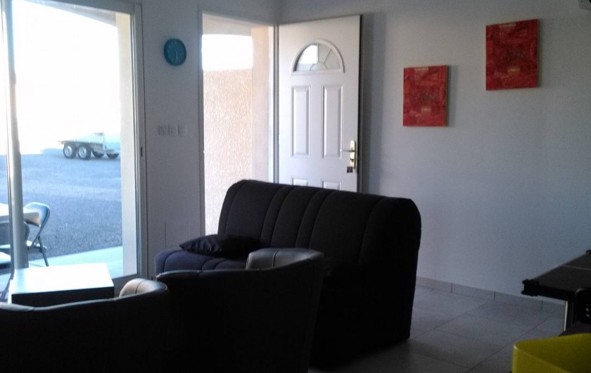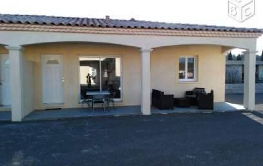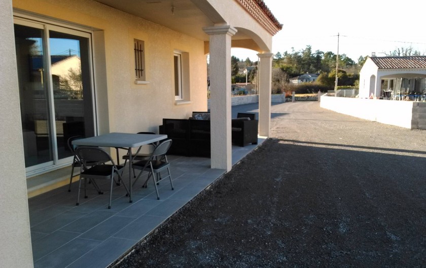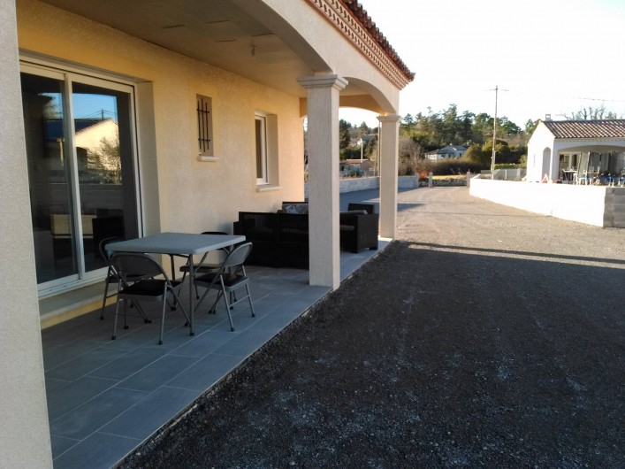 terrasse couverte avec salon de jardin, table, plancha, transats.