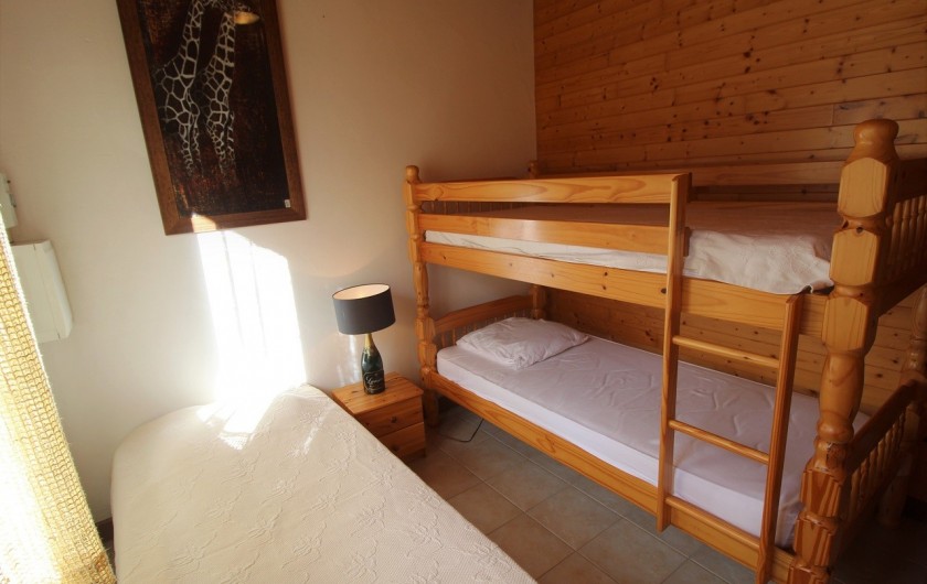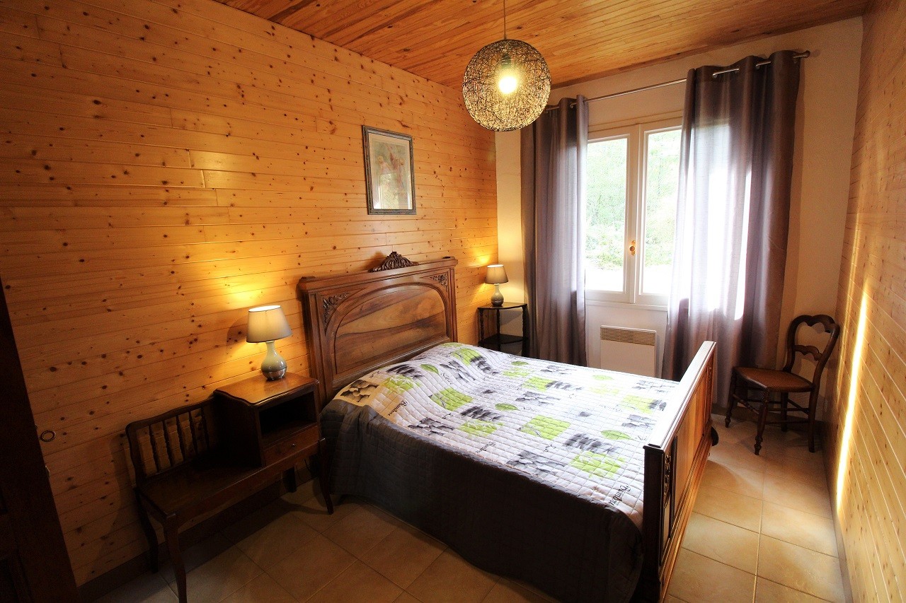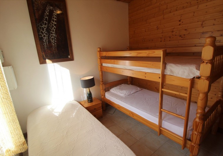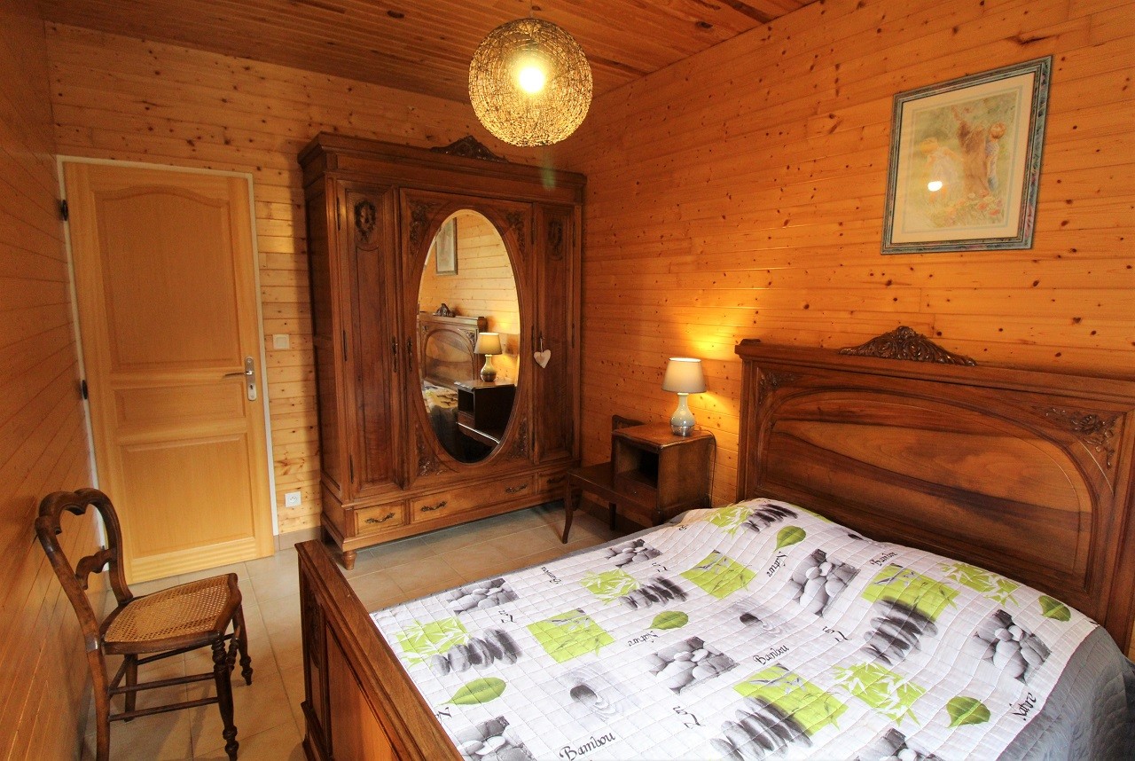 bois dans la pièce de jour : coin-cuisine, coin-salon (possibilité canapé convertible), coin-repas. 2 chambre (1 chambre 1 lit 2 personnes, 1 chambre 3 lits 1 personne dont 2 superposés), salle d'eau, douche à l'italienne, wc.