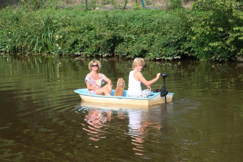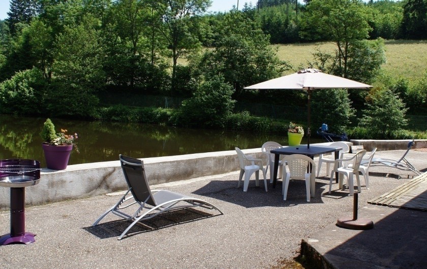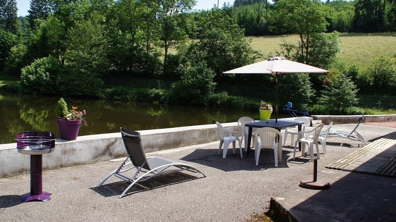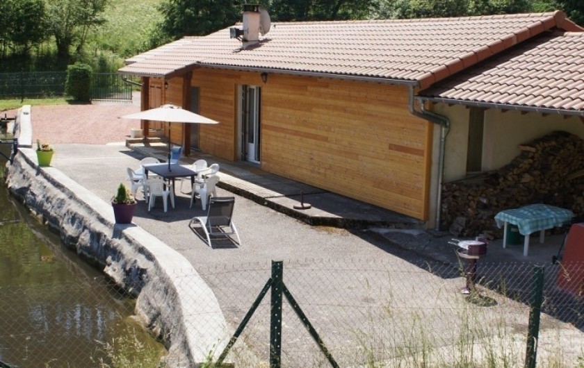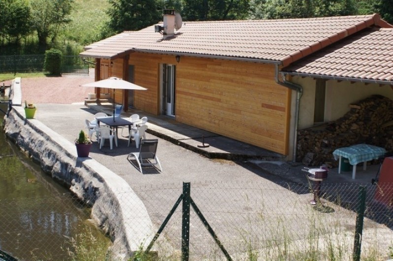 Vaste terrasse donnant directement sur l'étang, salon de jardin, barbecue, terrain clos.