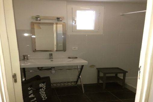 une salle de bain avec WC et douche, une terrasse avec mobilier de jardin et barbecue.