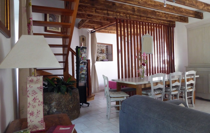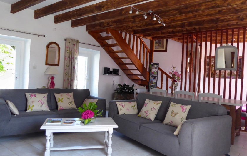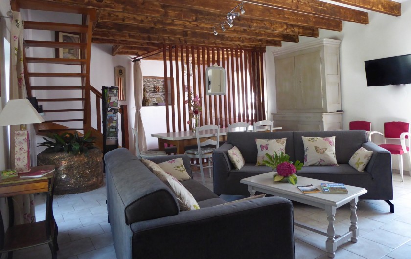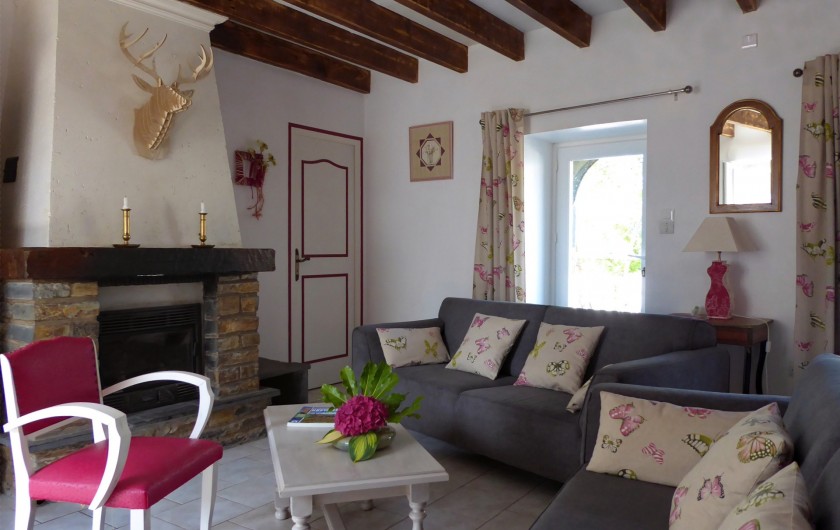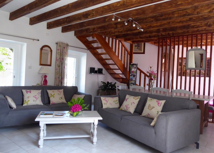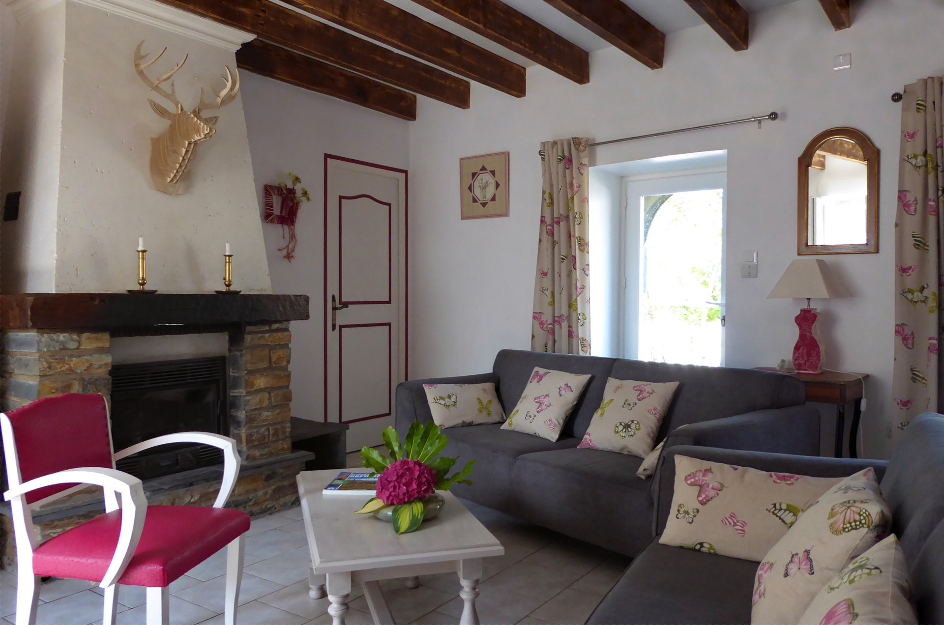 A droite, vous trouvez la salle à manger/salon de 35 m2 cache derrière une paroi à claire-voie un lit de 140 cm, idéal pour les personnes à mobilité réduite. Bien installés dans les canapés du salon vous regardez la télé, écoutez la chaîne Hi-Fi ou tout simplement rêver en regardant les flammes de l'insert placé dans la cheminée. Du salon vous avez accès à la salle d'eau et aux WC séparés ainsi qu'à la terrasse de 50 m2 avec barbecue, coin repas et espace détente à partir duquel vous profitez d'une vue sur tout le parc et la nature environnante,
