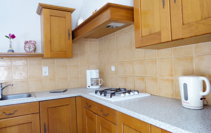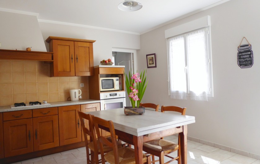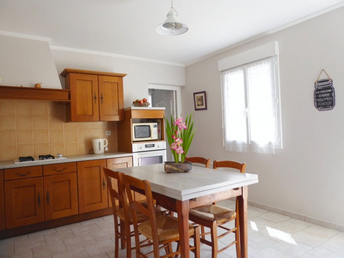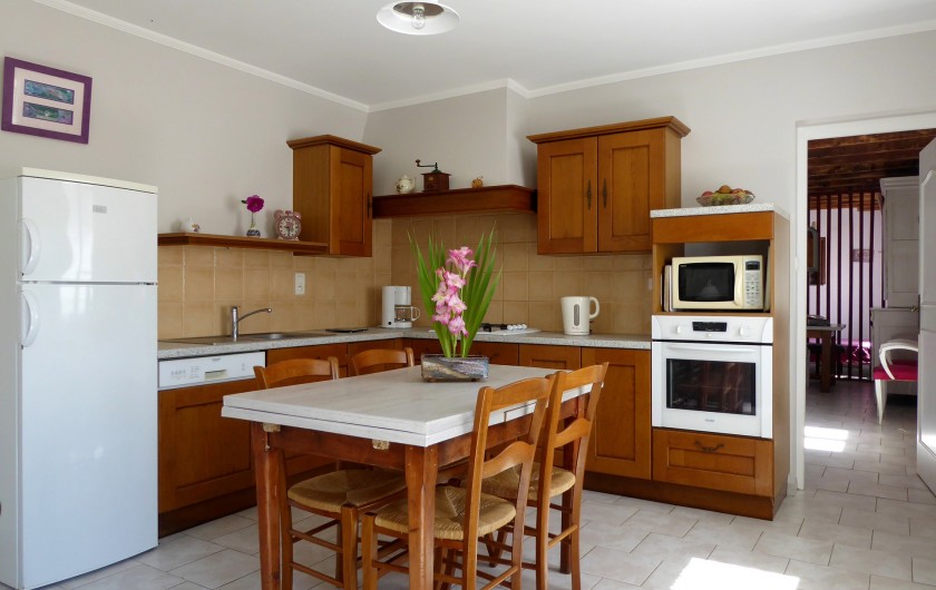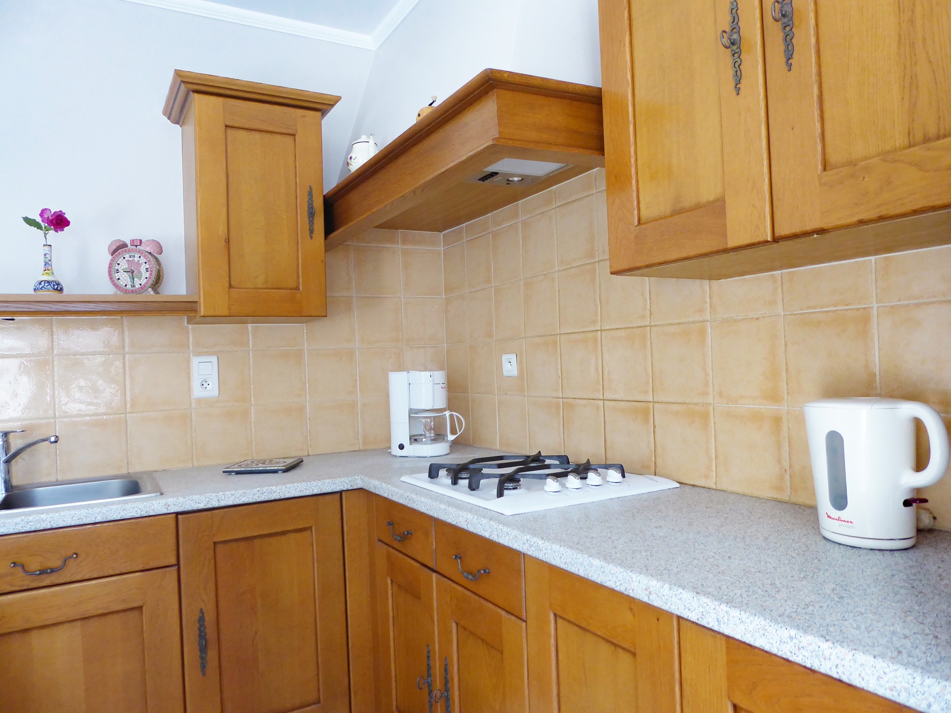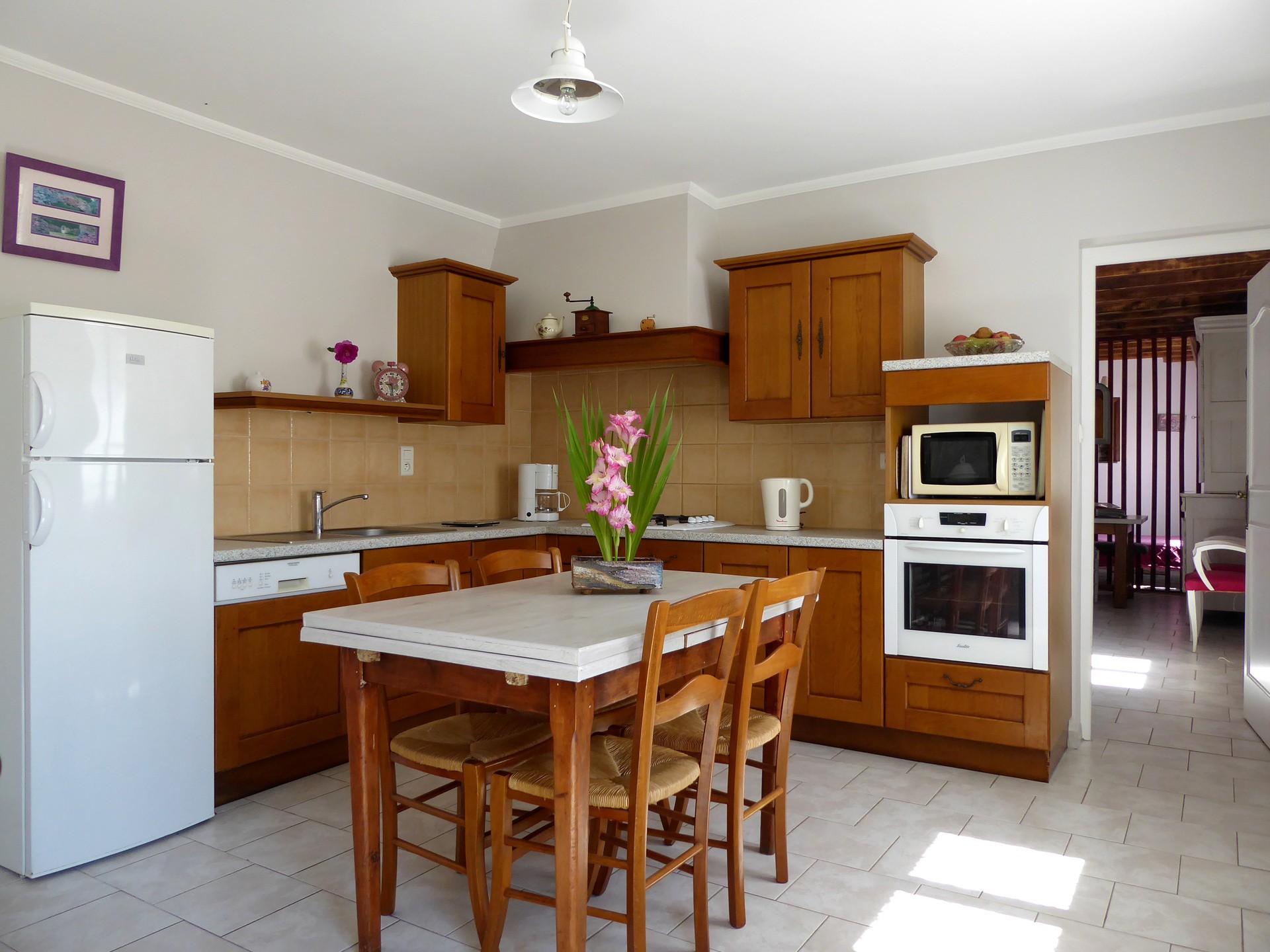 Vous entrez directement par la cuisine de 16 m2 entièrement équipée, de : four, plaque de cuisson, four micro-ondes, réfrigérateur-congélateur, table de cuisine et tout le matériel indispensable et même superflu d'une cuisine.